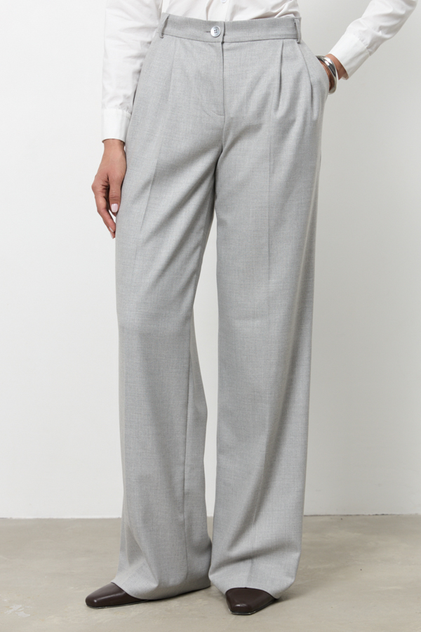 Брюки свободного силуэта из меланжевой костюмной ткани. На передней половинке выполнены карманы с подкройным бочком, по линии талии заложены складки. На задней половинке - талиевые вытачки и имитация карманов в рамку. Притачной пояс со шлёвками. Застёжка на молнию-гульфик и пуговицу. Такой крой выгодно подчеркнёт длину ваших ног.
