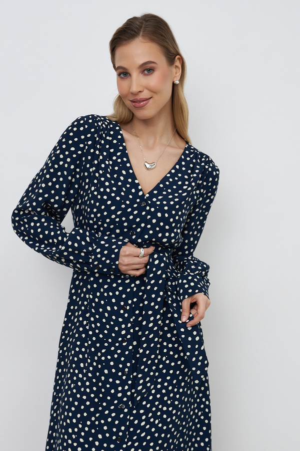 Платье из вискозной ткани свободного силуэта с притачным поясом к талиевым вытачкам. Изделие отрезное по линии талии, на которой заложены защипы. На передней и задней части изделия выполнена двойная кокетка со сборкой. По центру передней части застёжка на пуговицы, в боковых швах карманы. V-образный вырез горловины, визуально делает фигуру стройнее. Втачной длинный рукав на манжете с застёжкой на пуговицы.
