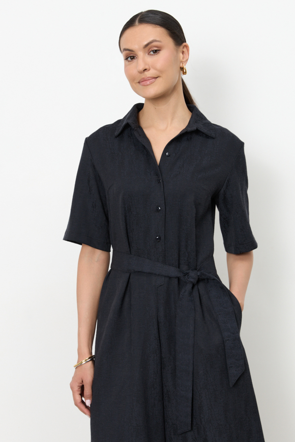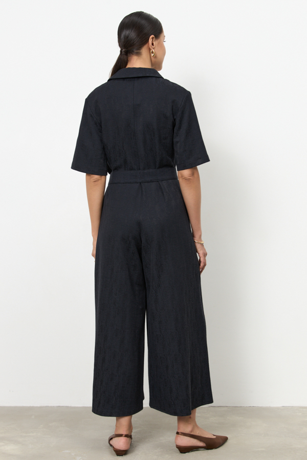 Стильный комбинезон из комфортной ткани. Свободный силуэт с застёжкой на пуговицы, в боковых швах карманы. Втачной короткий рукав. Вырез горловины обработан отложным воротником на стойке. Изделие с заниженной линией сидения обеспечивает комфортное движение. В комплекте пояс из основной ткани.