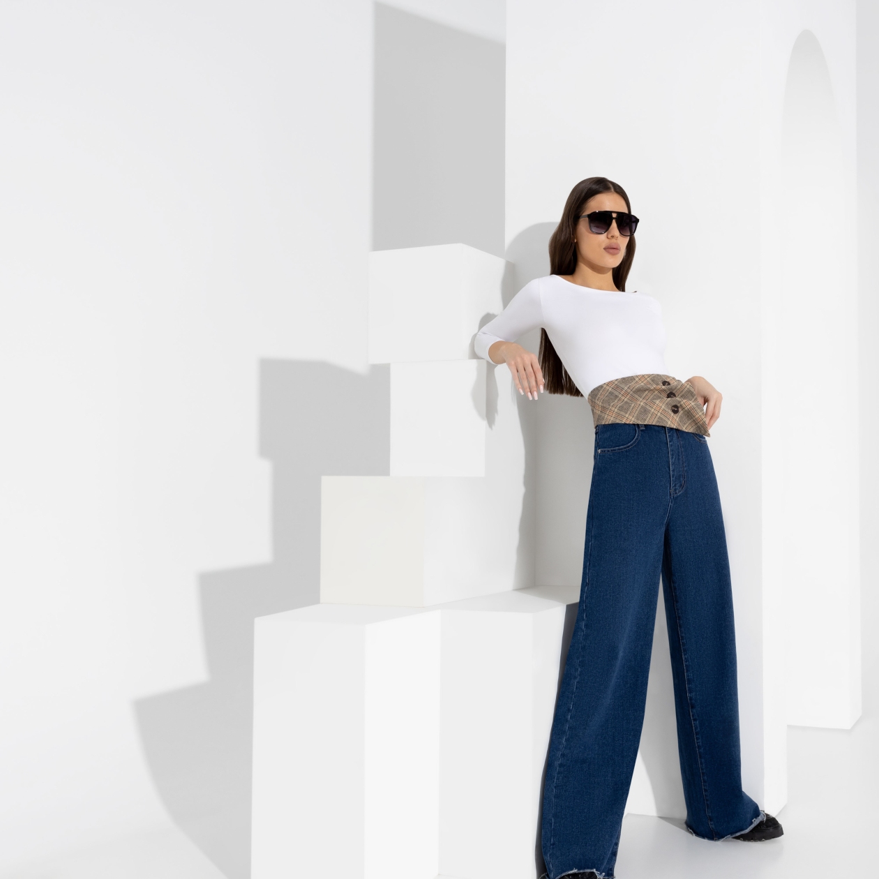 Акцент на талию! Асимметричный пояс с трендовым принтом «шотландка» - сам по себе уже очень яркая и сочная деталь. Рекомендуем добавить его к однотонной водолазке, джинсам или платью спокойного тона.