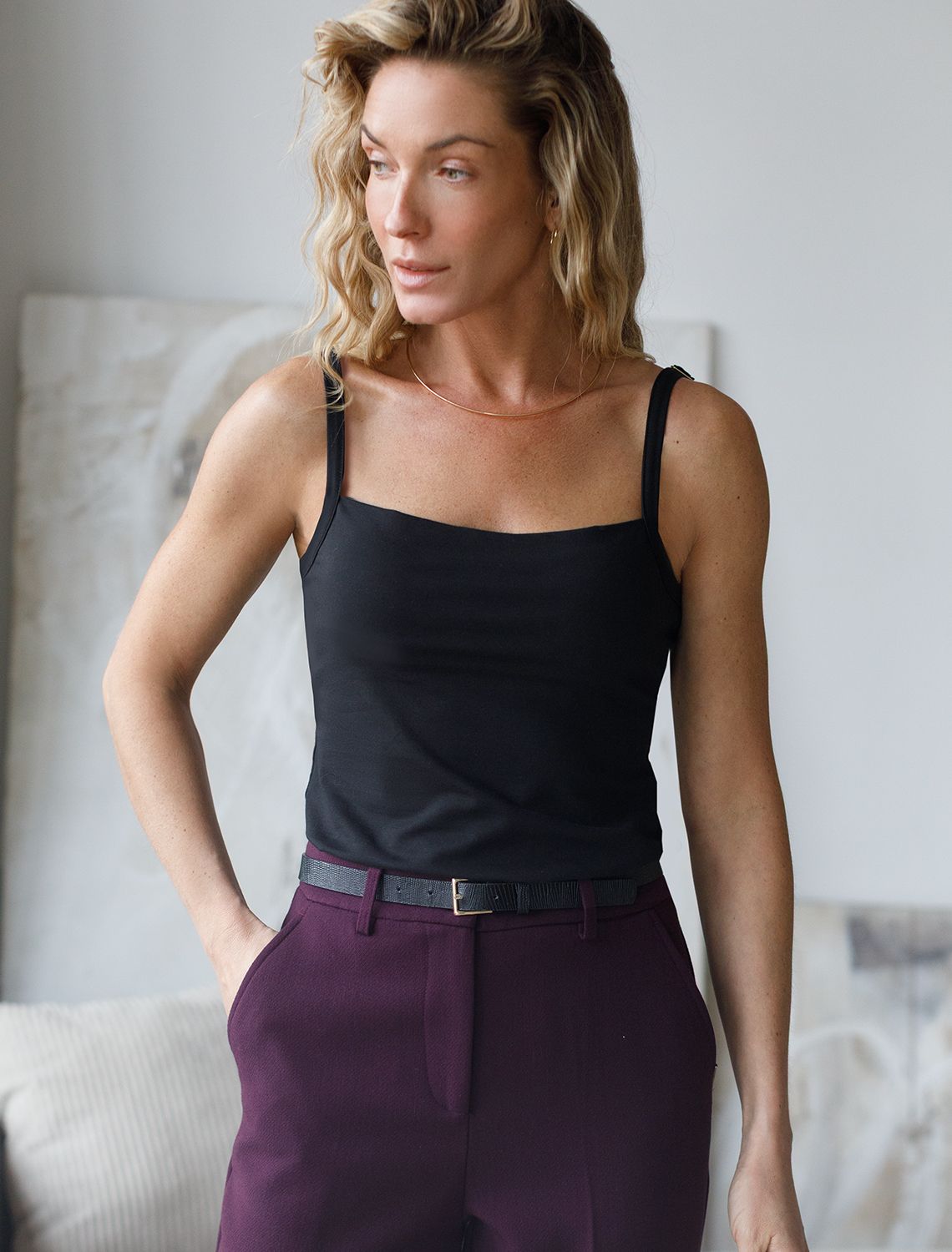 Стильный и базовый топ черного цвета полуприлегающего кроя идеально подходит для девушек и женщин всех возрастов. Двуслойная зона бра. Линия декольте образована посредством сгиба полотна без отсрочки и закреплением обоих слоев в шве проймы. Удобные регулируемые бретели. Прямой силуэт подходит любому типу фигуры. Квадратный вырез горловины - тренд этого сезона. Он выполнен из качественной дышащей ткани, что обеспечивает комфорт в жаркую погоду. Однотонный дизайн позволяет легко сочетать его с различными предметами гардероба, создавая элегантный повседневный образ.