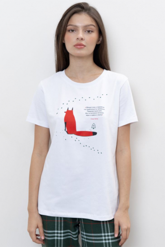 Футболка женская с круглым вырезом. Рукав втачной, короткий. Модель свободного прилегания, представлена в трех цветах. У каждого варианта цветового решения - уникальный принт.