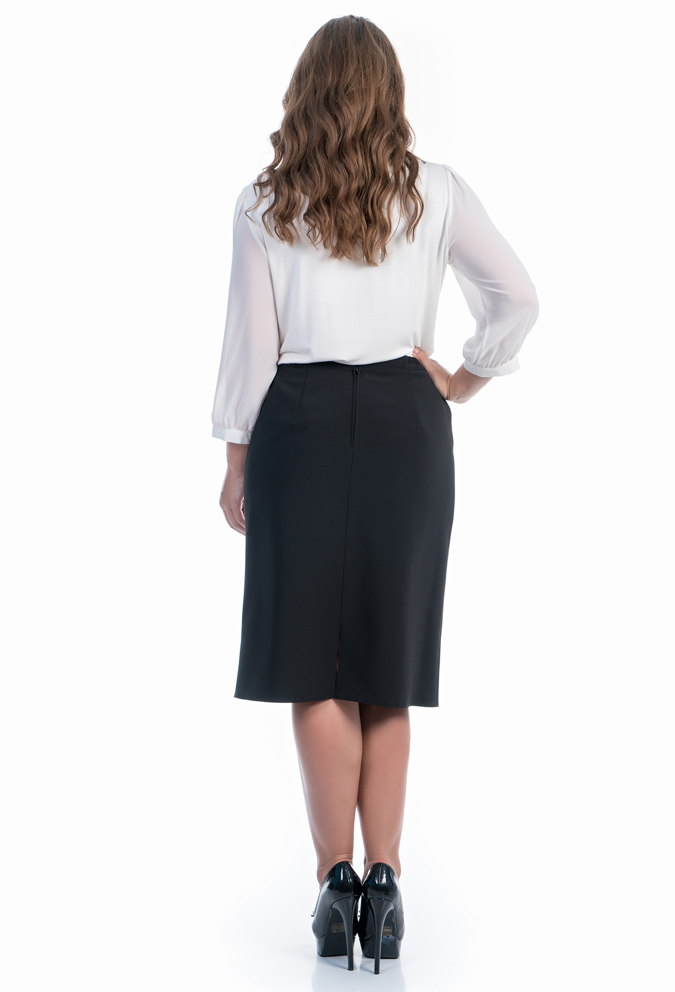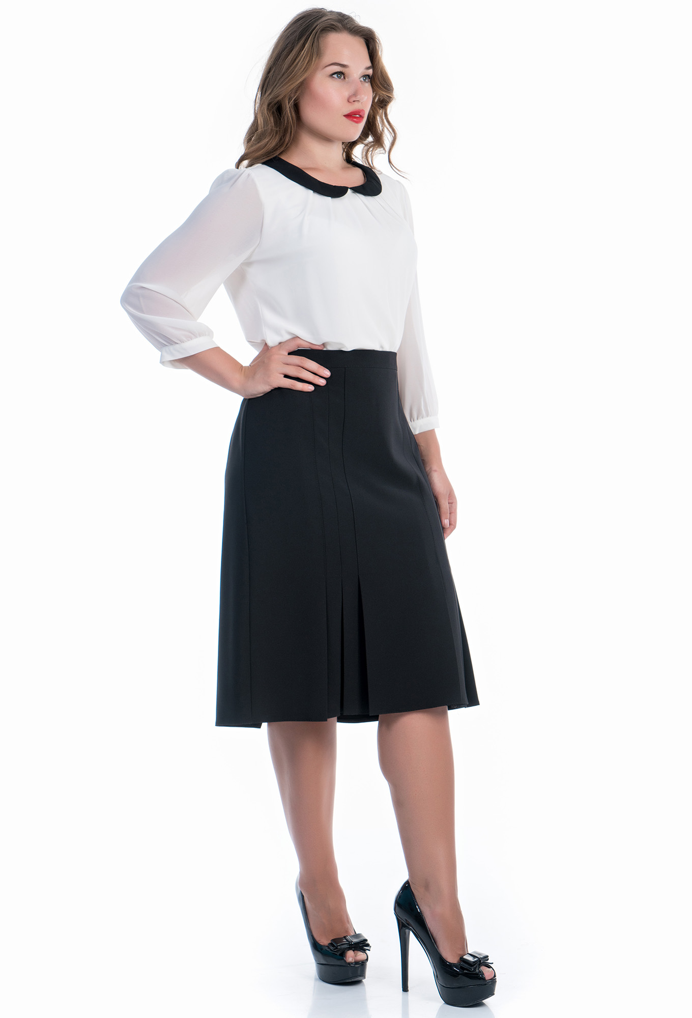 Юбка покроя "годе", полуприлегающего силуэта в деловом стиле костюмного полотна. Модель средней посадки, на притачном поясе, слегка расклешенная к низу. Перед украшен частично застроченными встречными складками. По центру заднего полотнища расположена застежка на пуговицу и потайную ленту-молнию.