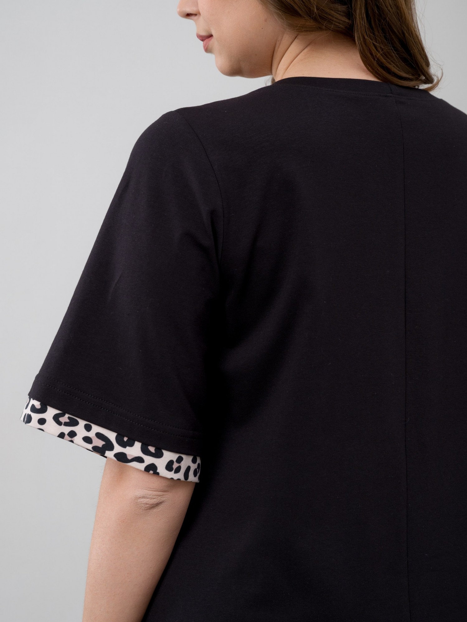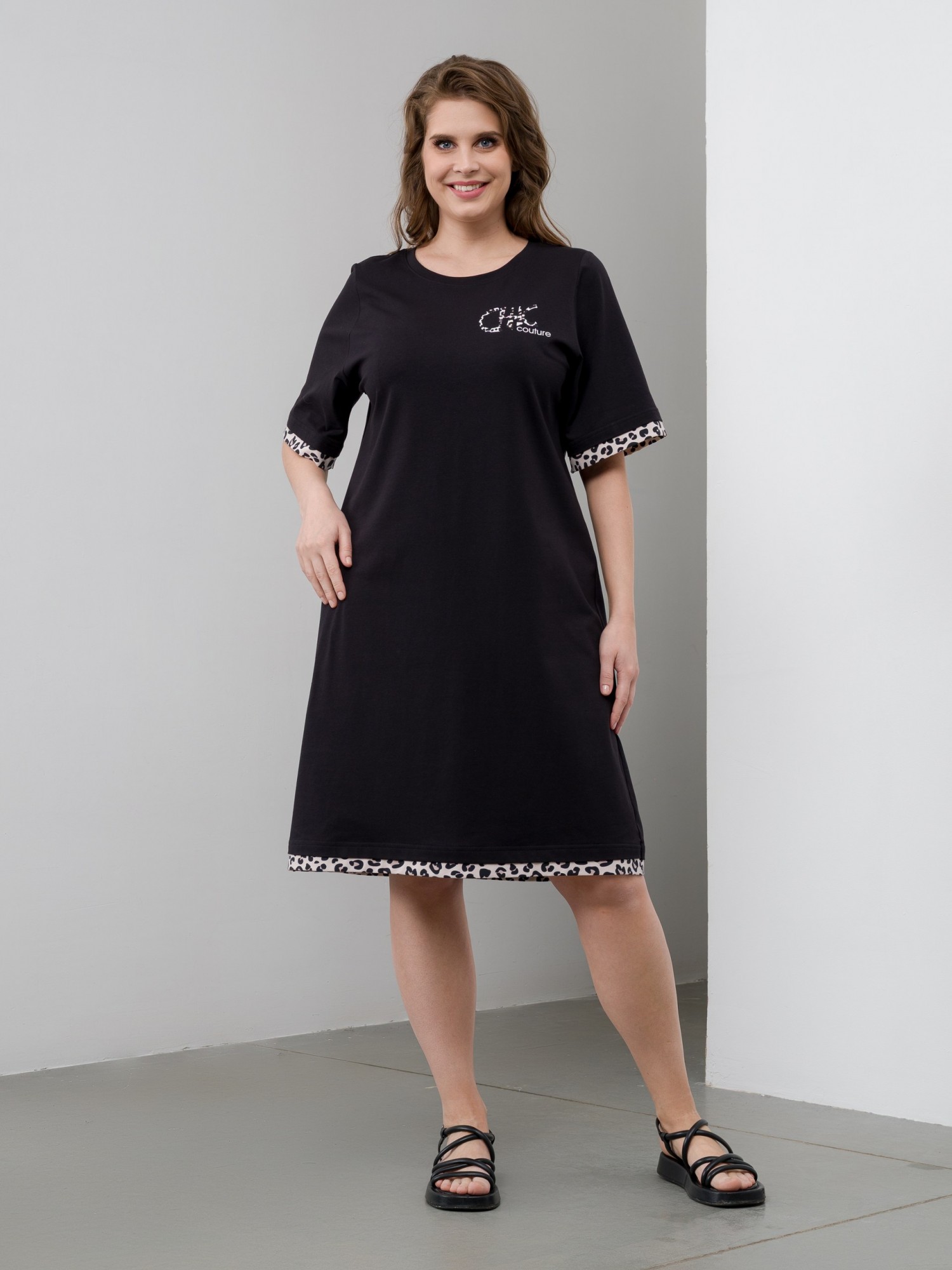Платье женское из трикотажного полотна «кулирка» с лайкрой в комбинации двух видов ткани: гладкокрашеной и с набивным рисунком и, прямого силуэта, с короткими втачными рукавами, горловиной овальной формы, обработанной втачной планкой. Рукава и низ туники отделаны притачными планками из контрастного материала, на полочке печать, выполненная в технике «шелкография».
