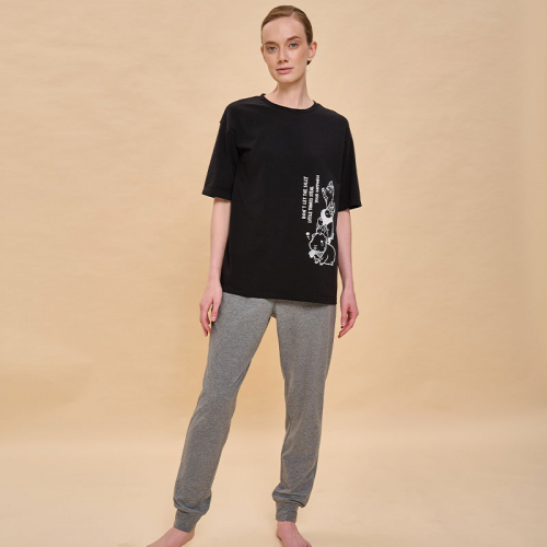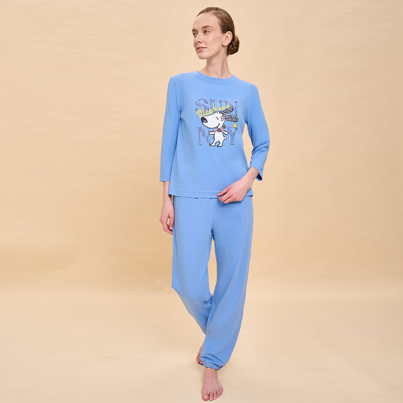 Состав: верх: 95%хлопок 5%эластан, низ: 95%хлопок 5%эластанОписание: Костюм пижамный женский. В составе ткани преобладает высококачественный хлопок — комплект для сна мягкий, гипоаллергенный и воздухопроницаемый. В хлопковой пижаме вам будет тепло и уютно во время сна. Эластан помогает модели надолго сохранить первоначальную форму. Джемпер и брюки умеренного объёма, плечо немного спущено, рукава широкие и свободные — в пижаме очень удобно спать. В поясе брюк и по низу штанин мягкие и широкие резинки — не перекручиваются и не давят. Отделка горловины из эластичной рибаны — она не растягивается, пижаму удобно надевать и снимать. Хлопковая пижама украшена милым, «няшным» принтом в виде счастливой собачки, надпись переводится: «солнечный выходной». Пижамный костюм неприхотлив в уходе. Принт эластичный и стойкий, хорошо переносят частые стирки. Пижама женская с брюками подходит как для сна, так и просто для отдыха дома, пижамной вечеринки. Помните о правильном уходе за изделием: рекомендуется стирать при температуре не выше 30 °C, без предварительного замачивания, с изнанки. Это поможет сохранить качество и цвет пижамы на длительное время. Не забывайте о выборе правильного размера. Используйте таблицу размеров на фотографии, чтобы выбрать подходящий для себя вариант. Обратите внимание, что цвет товара на экране вашего устройства может отличаться от реального.