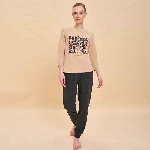 Состав: верх: 95%хлопок 5%эластан, низ: 95%хлопок 5%эластанОписание: Костюм пижамный женский. В составе ткани преобладает высококачественный хлопок — комплект для сна мягкий, гипоаллергенный и хорошо пропускает воздух. В хлопковой пижаме вам будет тепло и уютно во время сна. Благодаря эластану изделие надолго сохранит первоначальную форму. Джемпер и брюки умеренного объёма, плечо немного спущено, рукава широкие и свободные — в пижаме очень удобно спать. В поясе брюк мягкая и широкая резинка — не перекручивается и не давит. Отделка горловины из эластичной рибаны — она не растягивается, пижаму удобно надевать и снимать. Манжеты брючин широкие, из основной ткани — не передавливают ногу. Хлопковая пижама украшена милым, «няшным» принтом в виде забавного зайчика с позитивным настроением, надписи переводятся: «не бойся быть тем, кто ты есть», «ты уникален». Пижамный костюм неприхотлив в уходе. Принт мягкий и прочный, хорошо переносит частые стирки. Пижама женская с брюками подходит как для сна, так и просто для отдыха дома. Помните о правильном уходе за изделием: рекомендуется стирать при температуре не выше 30 °C, без предварительного замачивания, с изнанки. Это поможет сохранить качество и цвет пижамы на длительное время. Не забывайте о выборе правильного размера. Используйте таблицу размеров на фотографии, чтобы выбрать подходящий для себя вариант. Обратите внимание, что цвет товара на экране вашего устройства может отличаться от реального.