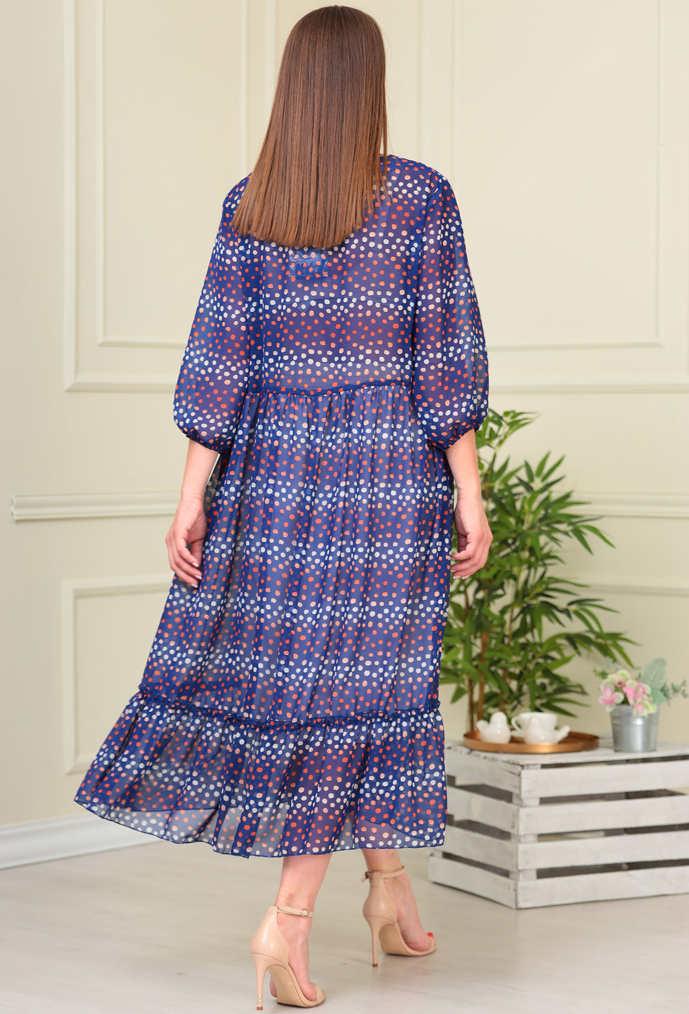 Платье свободного силуэта, длиной макси, выполнено из ткани с набивным рисунком. Платье с отрезным лифом. Полочка лифа с нагрудными вытачками. Горловина круглой формы. Спина лифа цельная. Рукав втачной, одношовный, длиной 3/4, по низу на резинке. Юбка платья со сборкой по шву притачивания к лифу. Низ юбки платья обработан притачным воланом со сборкой. Юбка платья на подкладке.