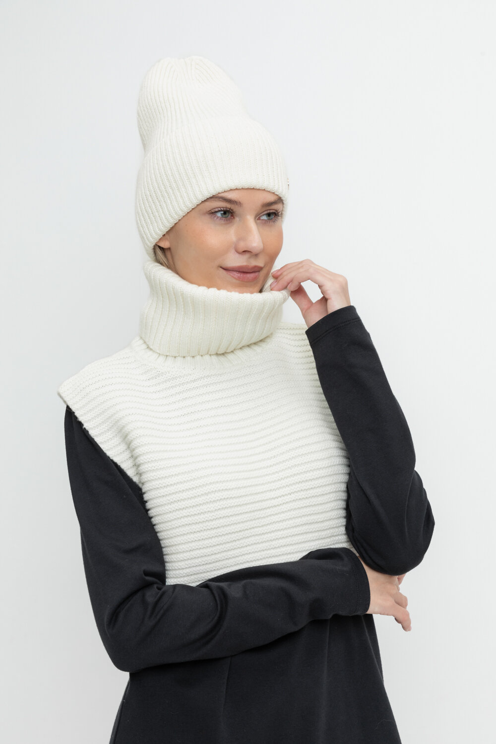 Уютная вязаная манишка с высоким воротником из шерсти и акрила. Шерсть в составе хорошо удерживает тепло, а волокна акрила делают изделие мягким и предотвращают деформацию и появление катышек. Лаконичный крой хорошо сочетается с верхней одеждой.