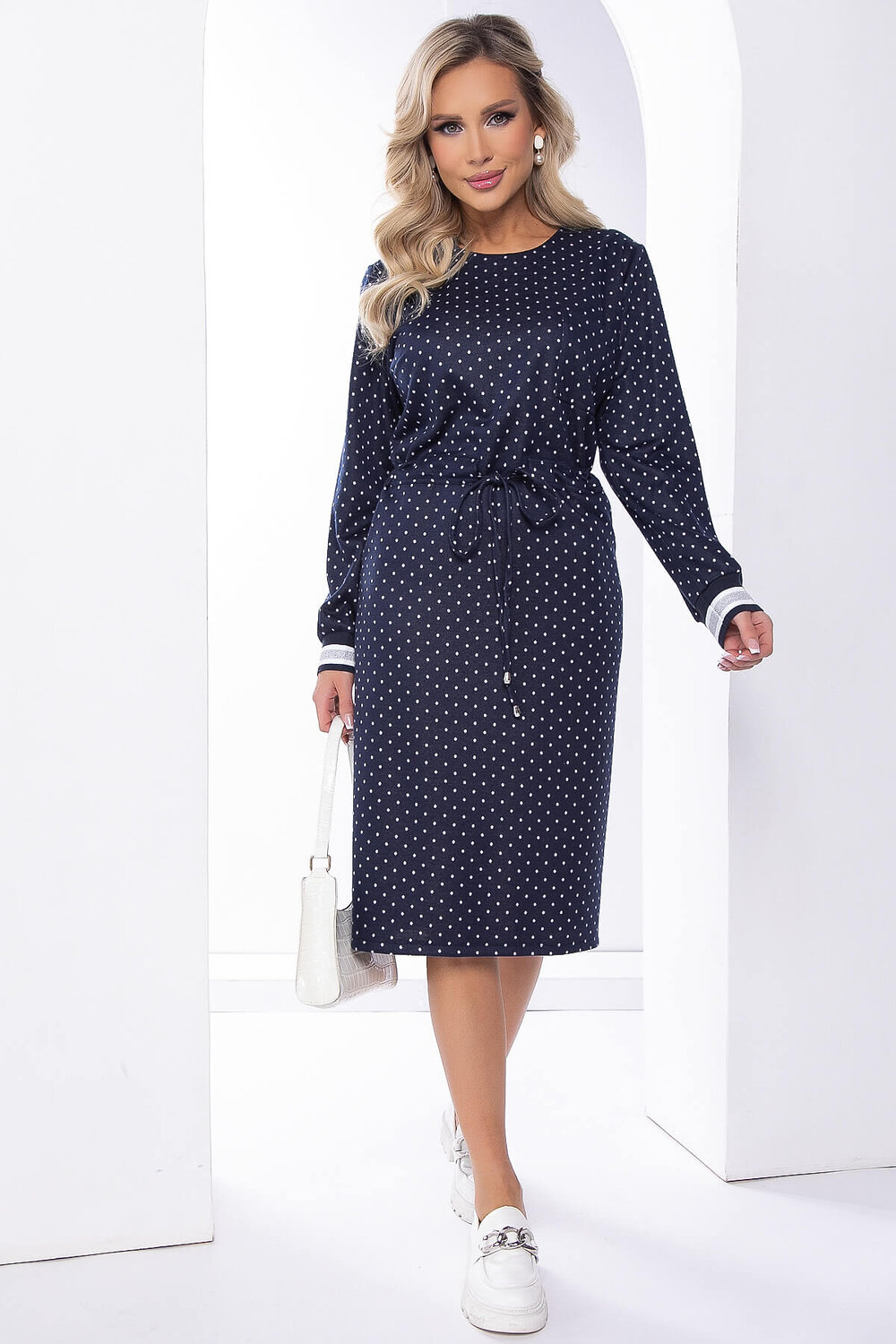 Элегантное платье из трикотажа прекрасно подойдёт для создания комфортного повседневного образа. Правильный крой и гармоничная длина обеспечат идеальную посадку. Изделие дополняет кулиска, которая подчеркивает линию талии. Рукав длинный, втачной, по низу контрастный манжет. Есть карманы.