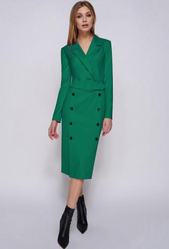 Брюки со стрелками на притачном поясе со шлёвками. Спереди косые карманы, застежка на молнию и декоративную пуговицу. Сзади два кармана-обманки с листочками. Талию подчёркивает съёмный пояс с пряжкой из основной ткани.