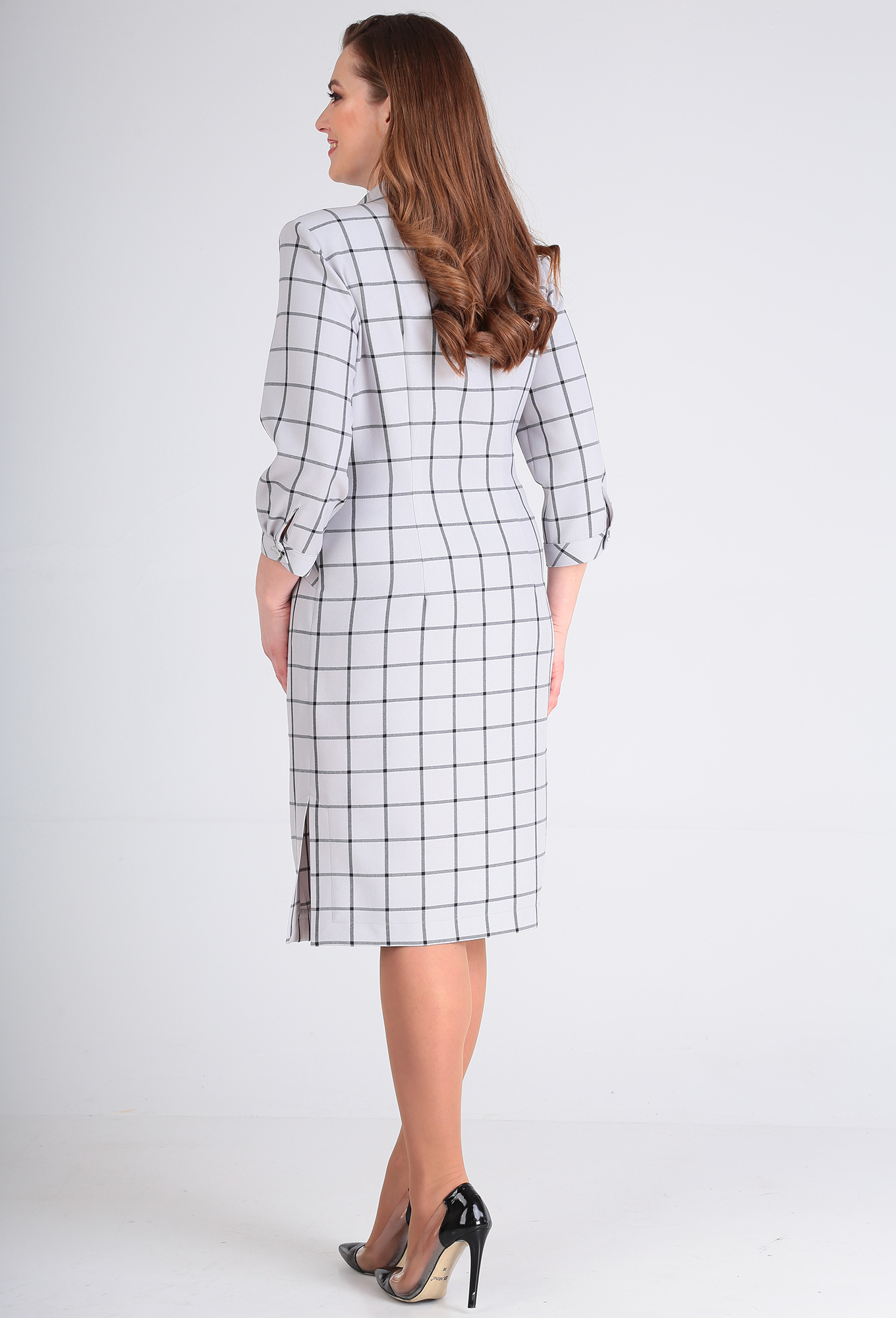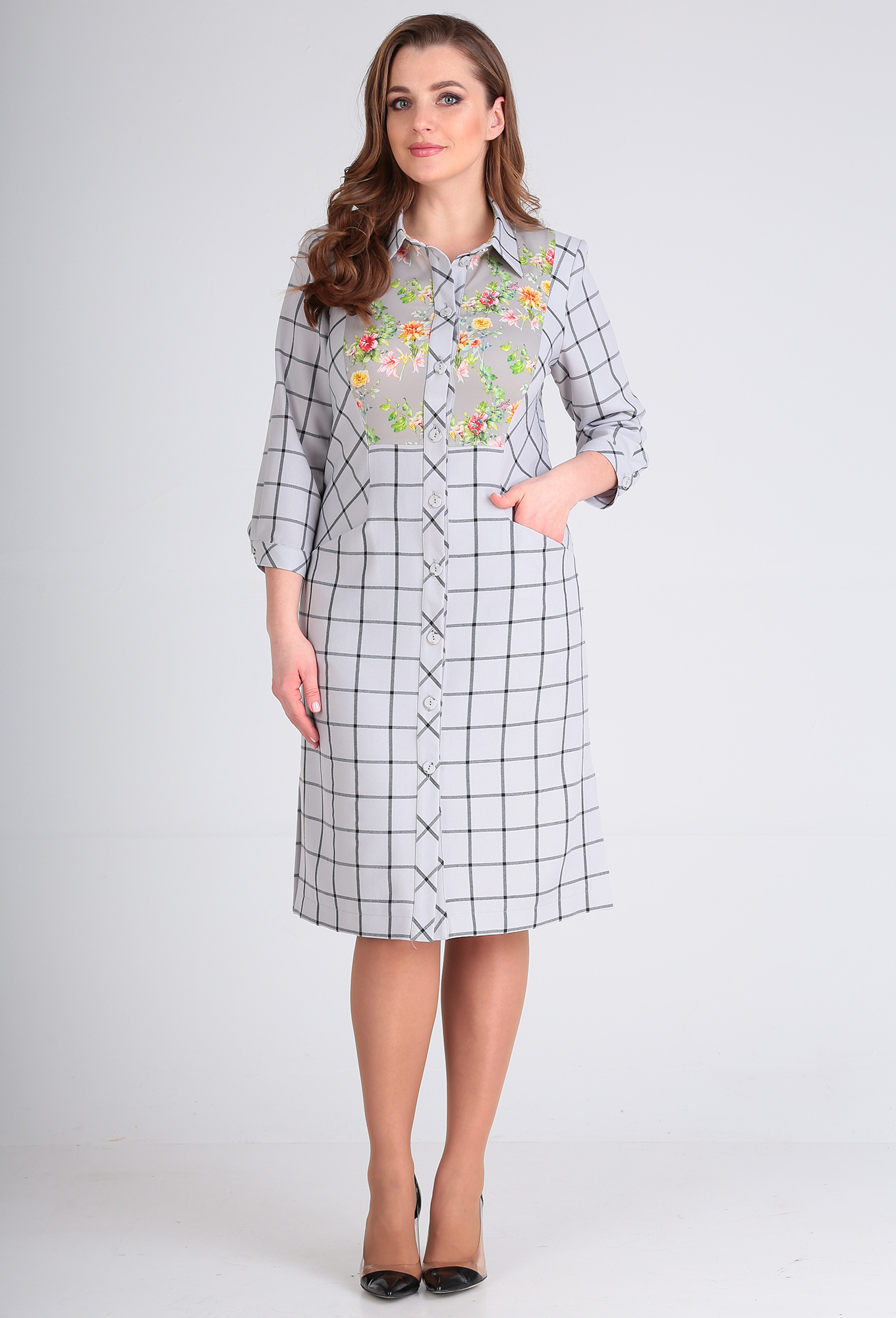 Платье выполнено из ткани в клетку и ткани с набивным рисунком "цветы". Платье полуприлегающего силуэта, длиной за колено. Полочка платья с центральной застежкой на планку с петлями и пуговицами. Горловина круглой формы со стояче-отложным воротником рубашечного типа. Полочка с отрезной кокеткой из отделочной ткани с набивным рисунком, бочком и карманом. Спинка цельная с талиевыми вытачками, по боковым швам в нижней их части обработаны разрезы. Рукав длиной 3/4, одношовный, втачной, понизу на притачной манжете с застежкой на петлю и пуговицу.