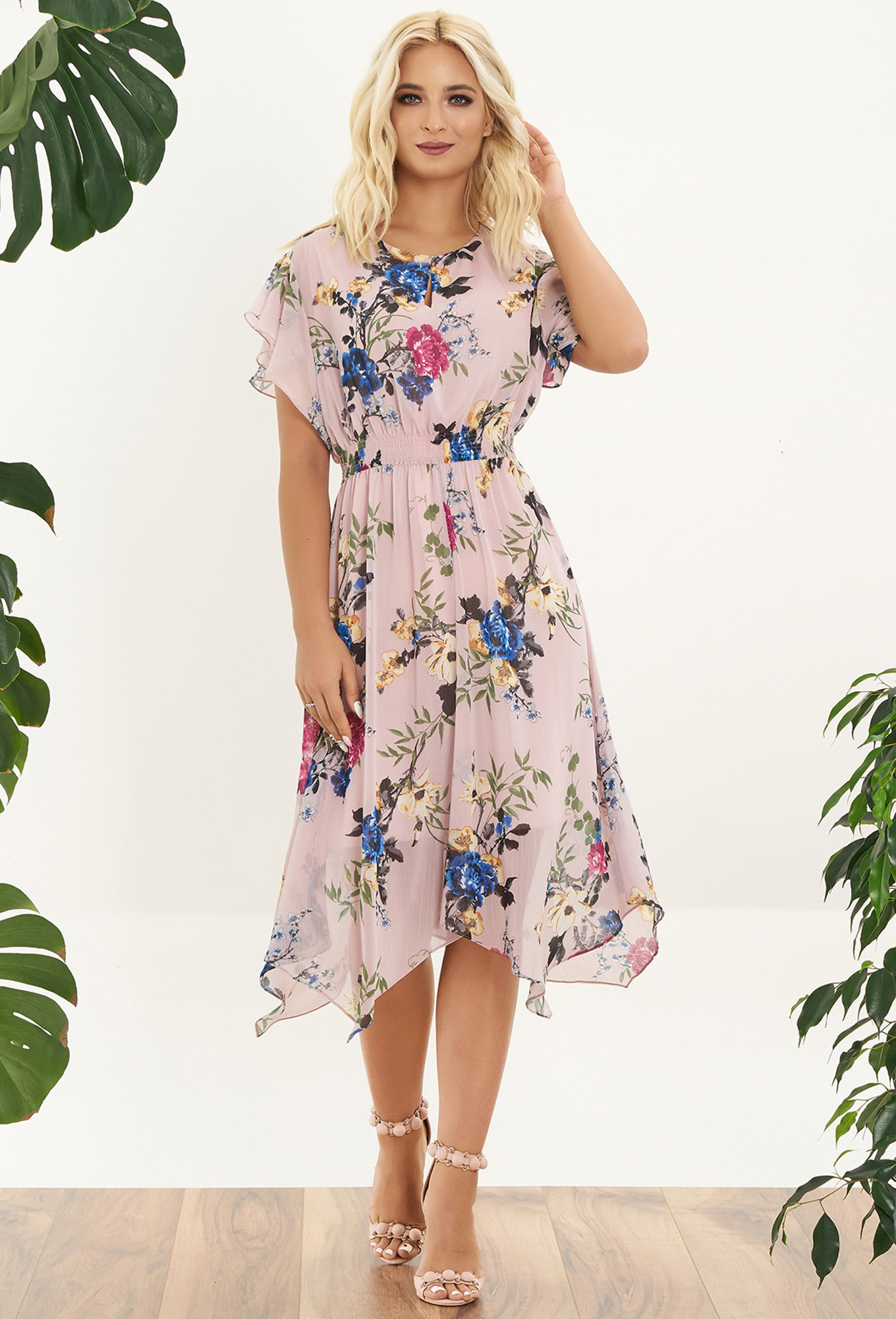 Романтическое платье из струящегося фактурного шифона с цветочным принтом и фигурным низом. Платье свободного кроя с акцентированной талией, собранной тонкими резинками в несколько рядов , что делает силуэт более женственным. Овальный вырез горловины с разрезом и застежкой на декоративную пуговицу. Короткий цельнокроеный рукав с декоративным воланом.