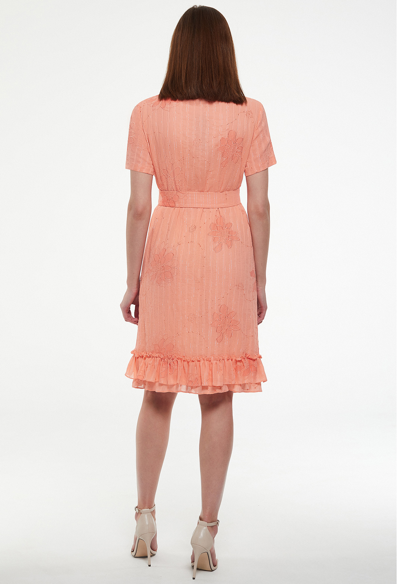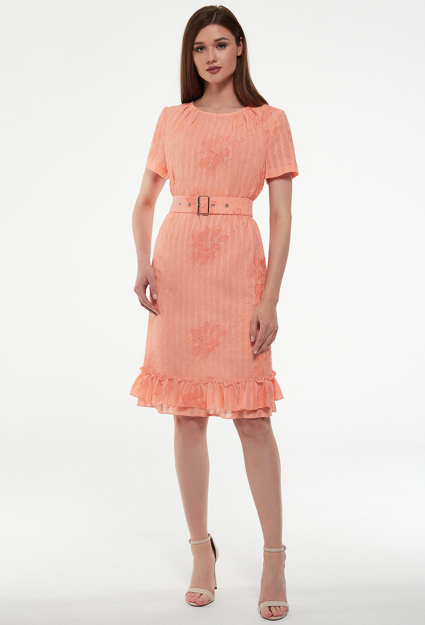Платье прямого силуэта, слегка расширенное книзу. С округлой формой горловины, по переду со складками, низ платья с оборкой. Рукава втачные одношовные, линия талии подчёркнута поясом из основной ткани с пряжкой.