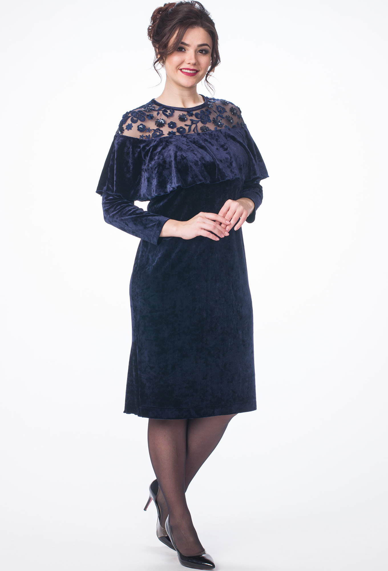 Платье нарядное, полуприлегающего силуэта, из эластичной бархатной ткани. По низу спинки подрезной волан. Кокетка из декоративного кружева в цвет ткани. По низу кокетки волан из основной ткани. Рукав прямой, зауженный к низу. Длина рукава (от начала волана) 43 см; длина платья по спинке 103 см