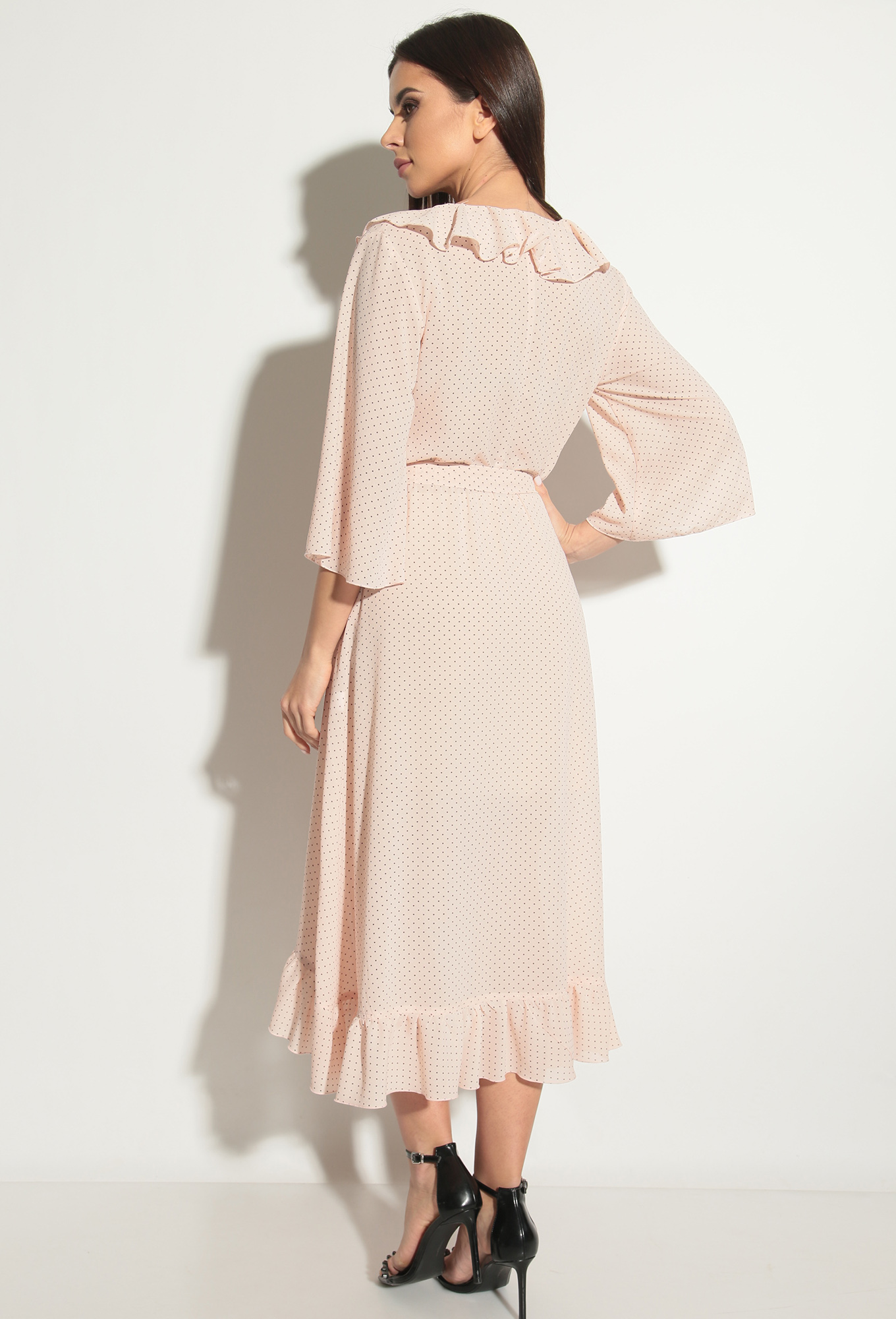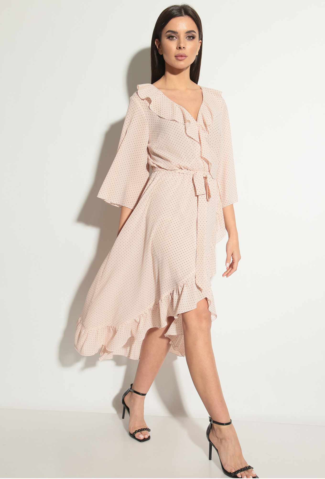 Модное в этом году, платье на запах, выполнено из струящегося шифона цвета чайной розы в мелкий горошек. Клешеная юбка , как и лиф украшена воланами. Рукав свободный до локтя, так же имеет небольшое клешение. По поясу вставлена резинка. Так как изделие из тонкой ткани, в комплекте прилагается съемный, тонкий и короткий подъюбник. Длина изделия по спинке 120 см, длина рукава от плечевого шва 43 см. Изделие подойдет на рост 170 см.