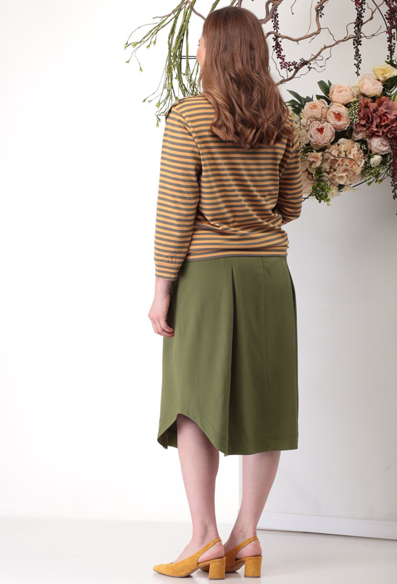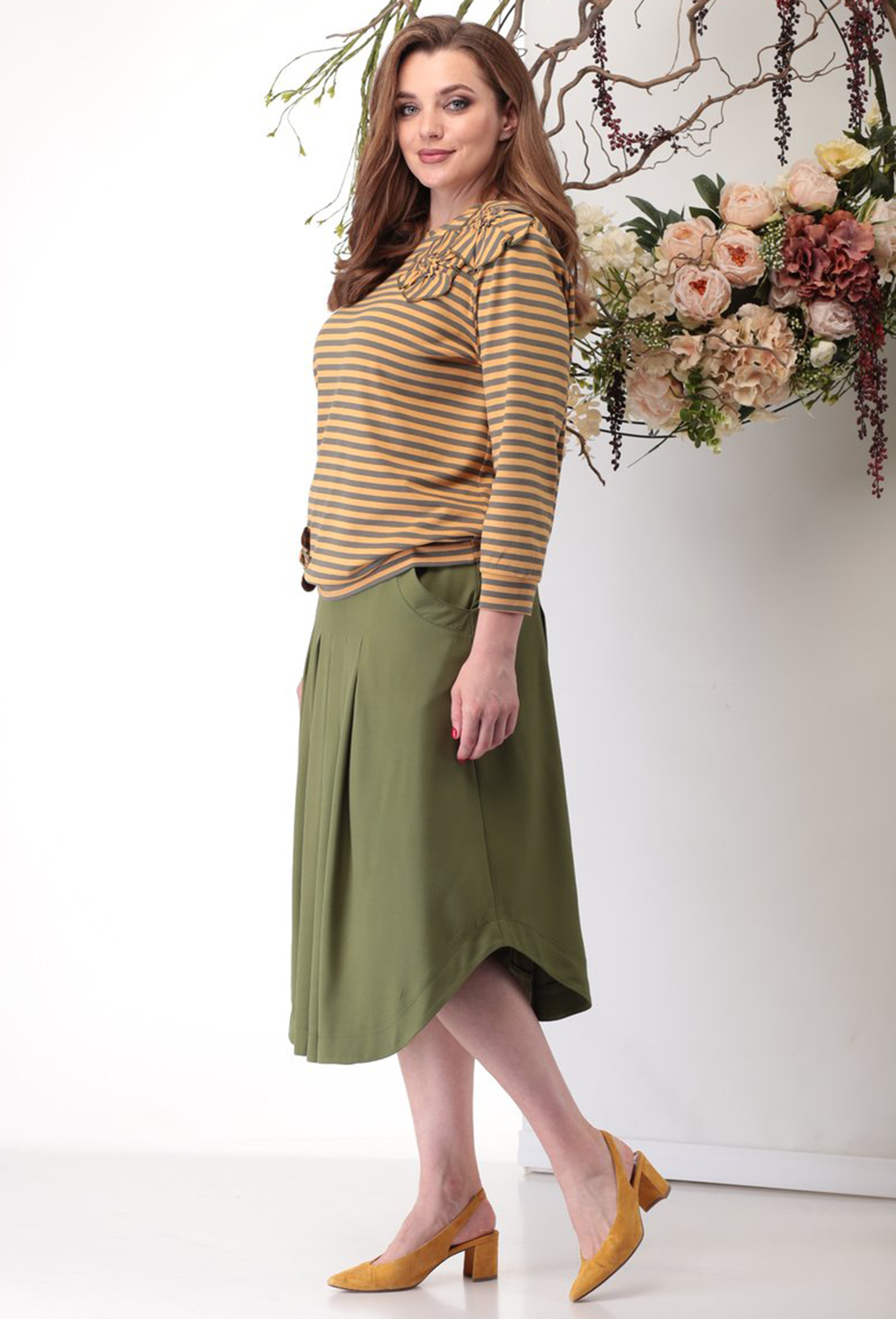Юбочный костюм для повседневной жизни, где оба изделия прекрасно вольются в Ваш гардероб и станут незаменимы, даже по отдельности. Трикотажный джемпер в полосочку украшен аппликацией из цветков, рукав и низ на манжете. Юбка выполнена из 100%вискозы, имеет клешение благодаря встречным складкам, по бокам карманы, пояс частично на резинке. Длина юбки 75 см (±1 см). Длина джемпера по спинке 70 см (±1 см). Подойдет на рост 170 см.