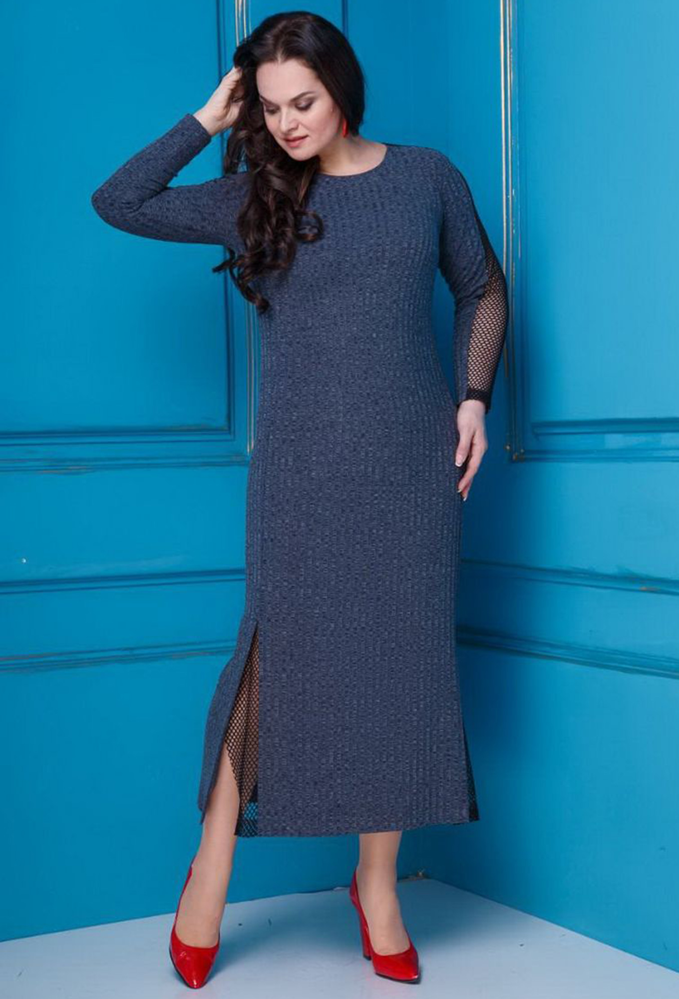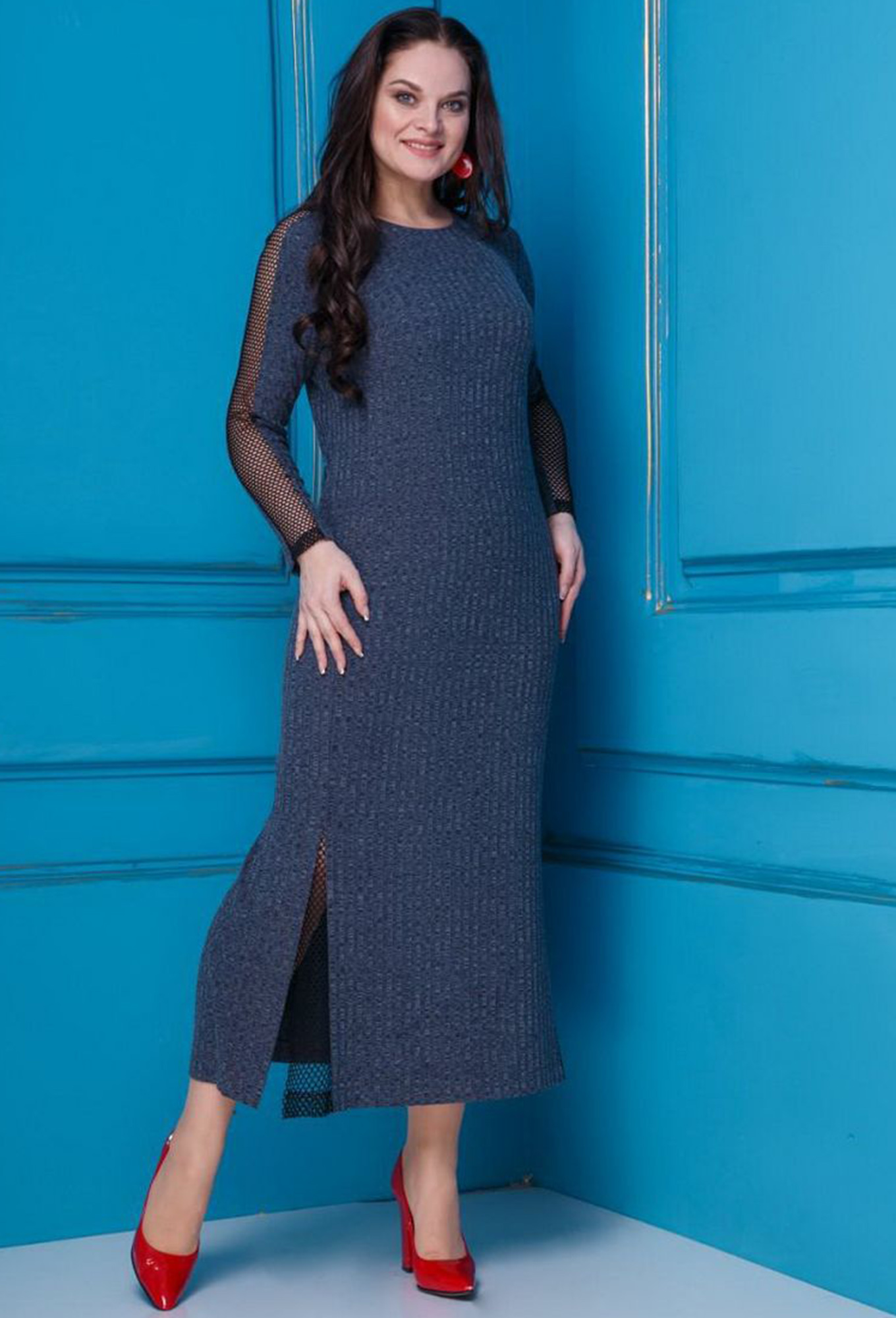 Платье женское из трикотажного полотна, серо-синего цвета в полоску и отделки: сетка черного цвета. Платье длинное, до косточки. По переду- узкие рельефные швы с проймы, переходящие в шлицу к низу. С рельефных швов-нагрудные вытачки. В шлице-вставки из черной сетки, которые закреплены вверху отделочной строчкой. По спинке -средний шов. Горловина овальной формы, на обтачке. Рукав-реглан, длинный, втачной, с широкой вставкой из отделочной ткани - черная сетка.