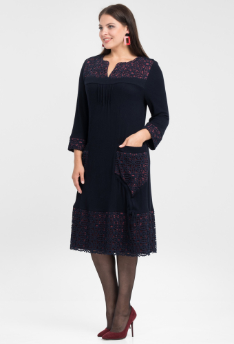 Комплект двух-предметный: платье, накидка. Прилегающее платье-карандаш с завышенной линией талии, подчеркнутой приточным поясом.Округлая горловина. Застежка на молнию на спинке в центральном шве. Съемная накидка с рукавом 3/4, выполнена из нежного кружева и застегивается на маленькую пуговку.