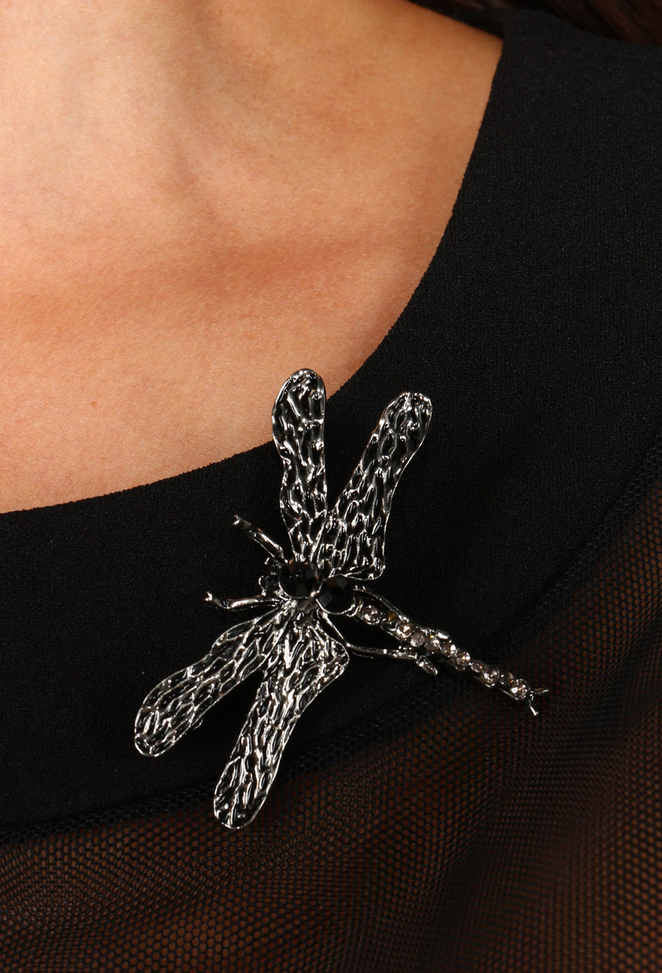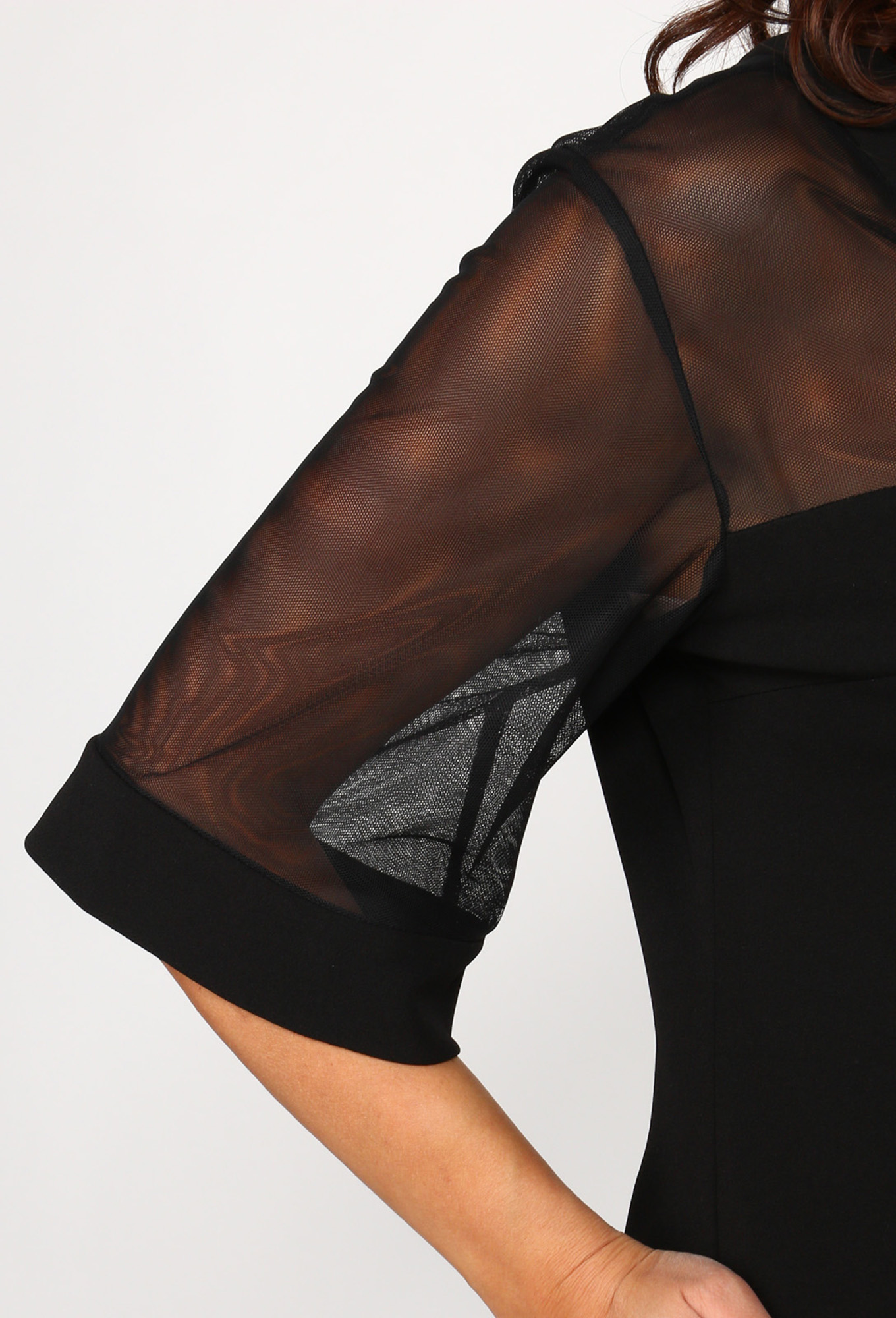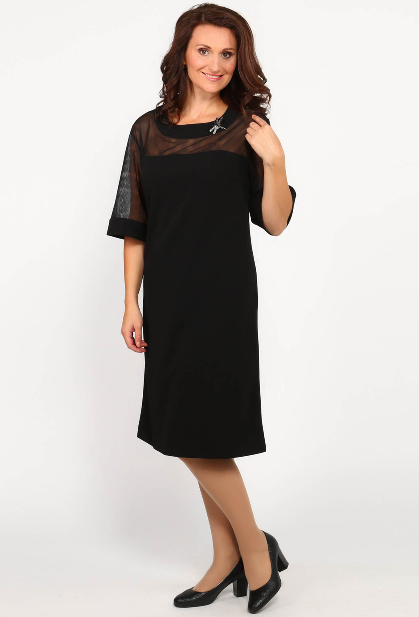 Платье нарядное, полуприлегающего силуэта, из комбинированных тканей. Перед и спинка с отрезной кокеткой из трикотажной сетки. Горловина обработана притачной планкой из основной ткани. Рукав втачной короткий, по низу обработан основной манжетой. В комплекте украшение брошь (может отличаться от фото).