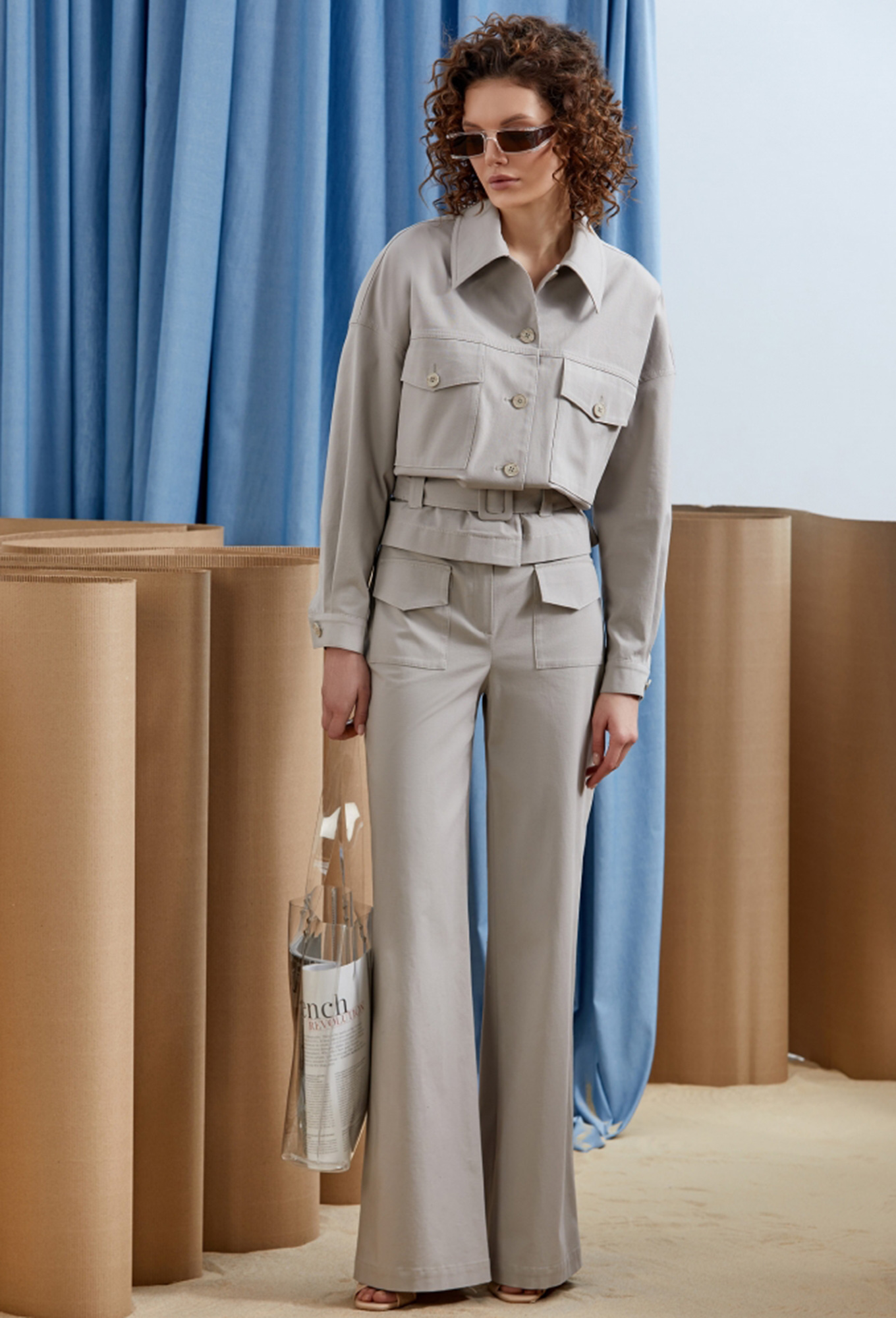 Куртка прямого силуэта со спущенной линией плеча, рубашечным воротником, центральной однобортной застежкой на петли и пуговицы. Перед с кокеткой и накладными карманами с клапанами, спинка с фигурной кокеткой. Рукав втачной двухшовный с притачной манжетой. Изделие со съемным поясом, на подкладке. Универсальное цветовое решение изделия сделает эту вещь любимой в вашем гардеробе.
