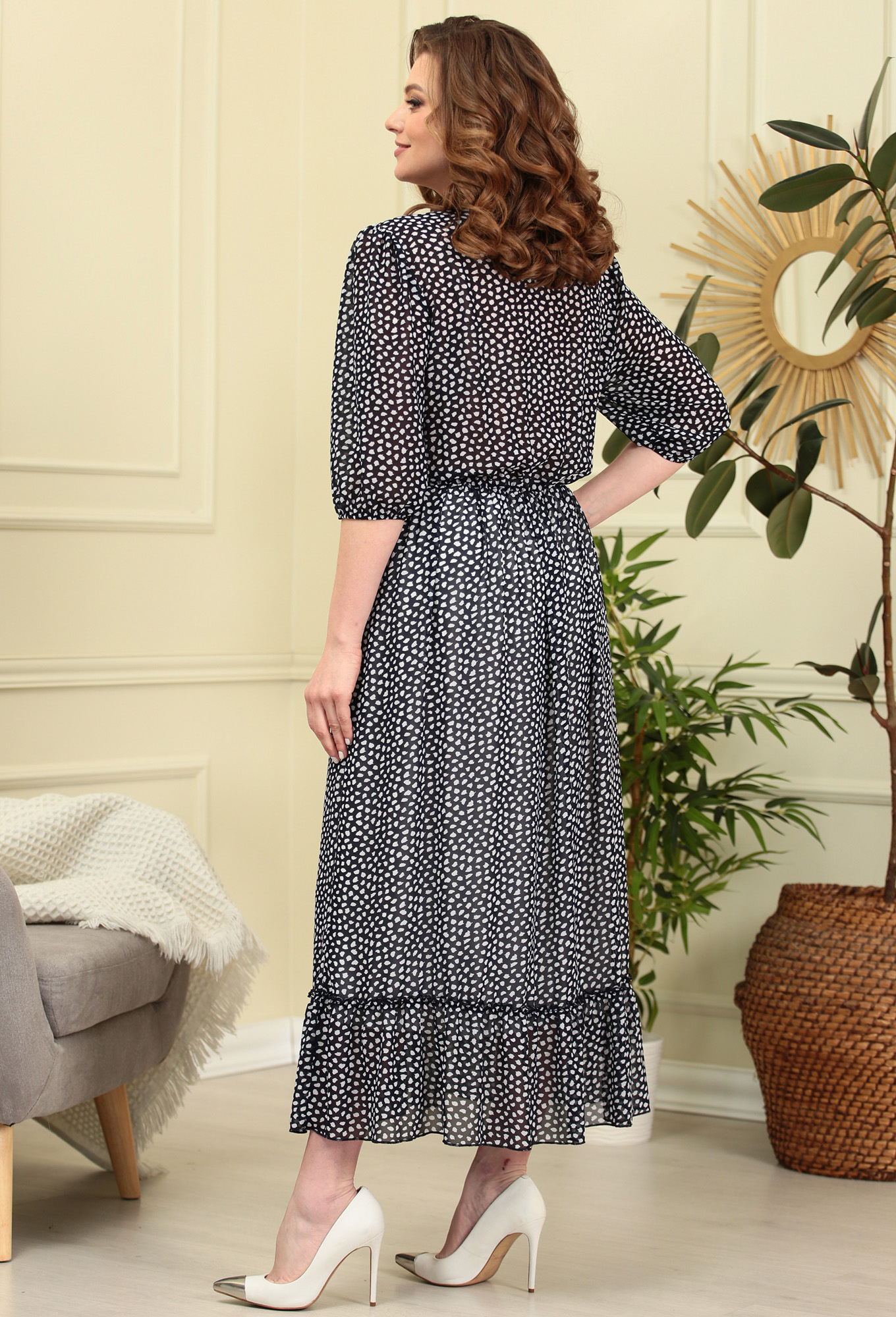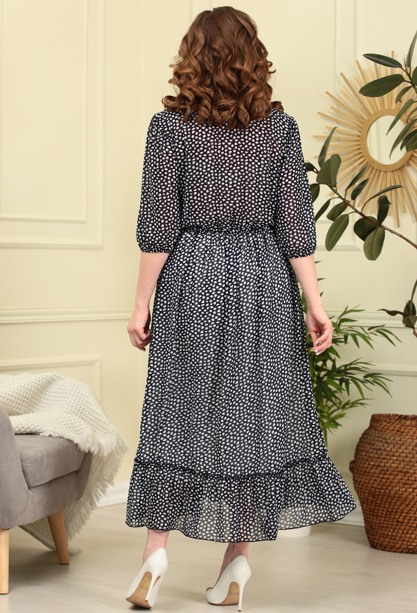 Платье свободного силуэта длиной макси, выполнено из шифона с набивным рисунком. Платье отрезное по линии талии, полочка лифа с застежкой на петли и пуговицы, с нагрудной вытачкой и V-горловиной. Спинка лифа цельная. Рукав длиной до локтя, одношовный, втачной, со сборкой по окату и по низу. По шву притачивания лифа к юбке настрочена резинка. По низу юбки обработан притачной волан. Платье на подкладке.