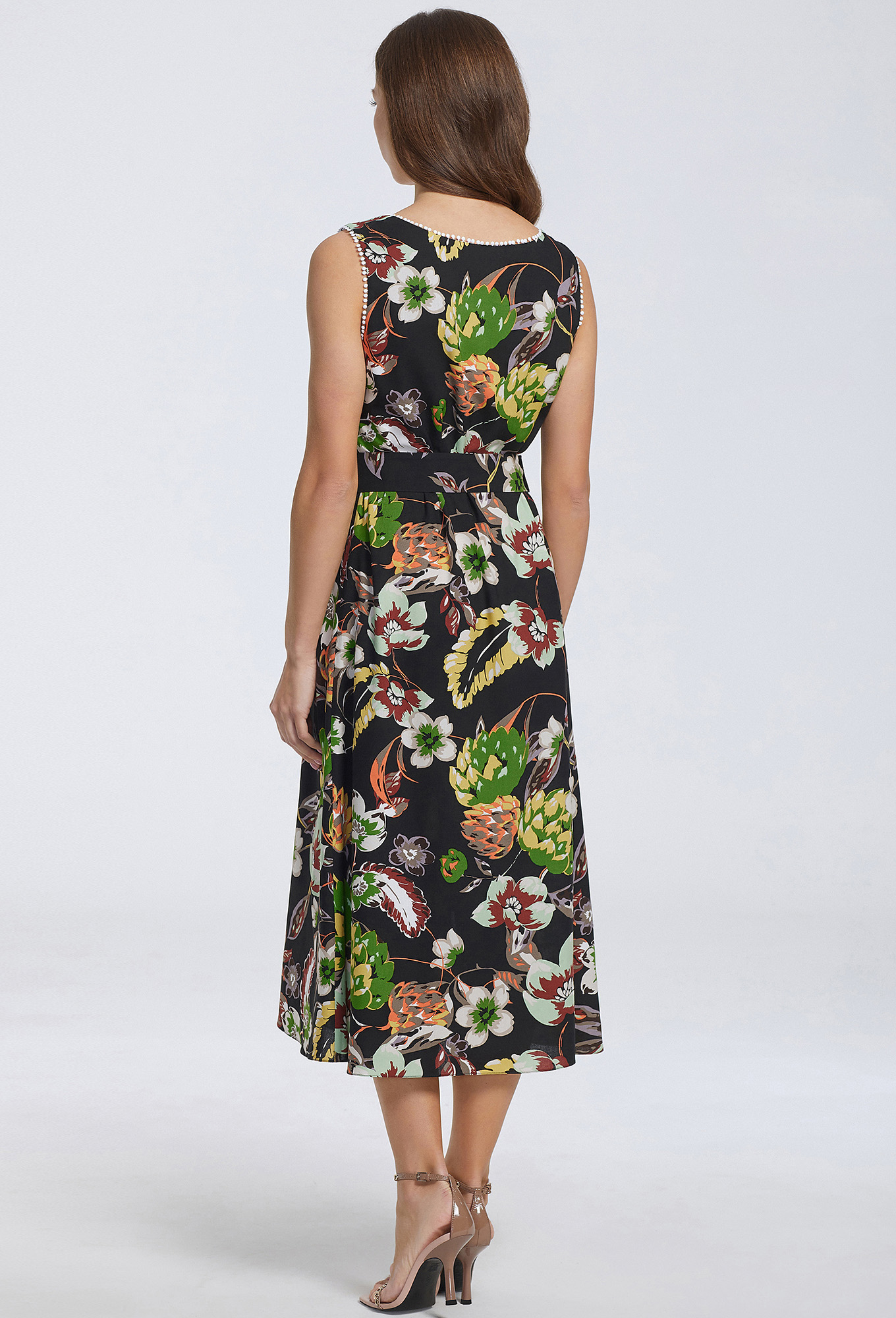 Черное платье может выглядеть романтично, и эта модель с ярким цветочным узором – тому доказательство. Настроение усиливает белая отделочная тесьма по горловине, брителям и проймам. Платье-миди лаконичного кроя с расклешённым подолом сшили из приятной итальянской вискозной ткани. Чтобы сделать модель ещё более эффектной, линию талии подчеркнули широким поясом с контрастными пряжками.