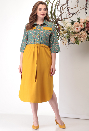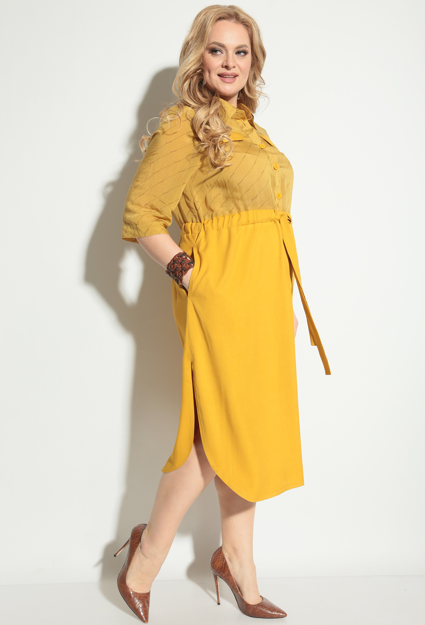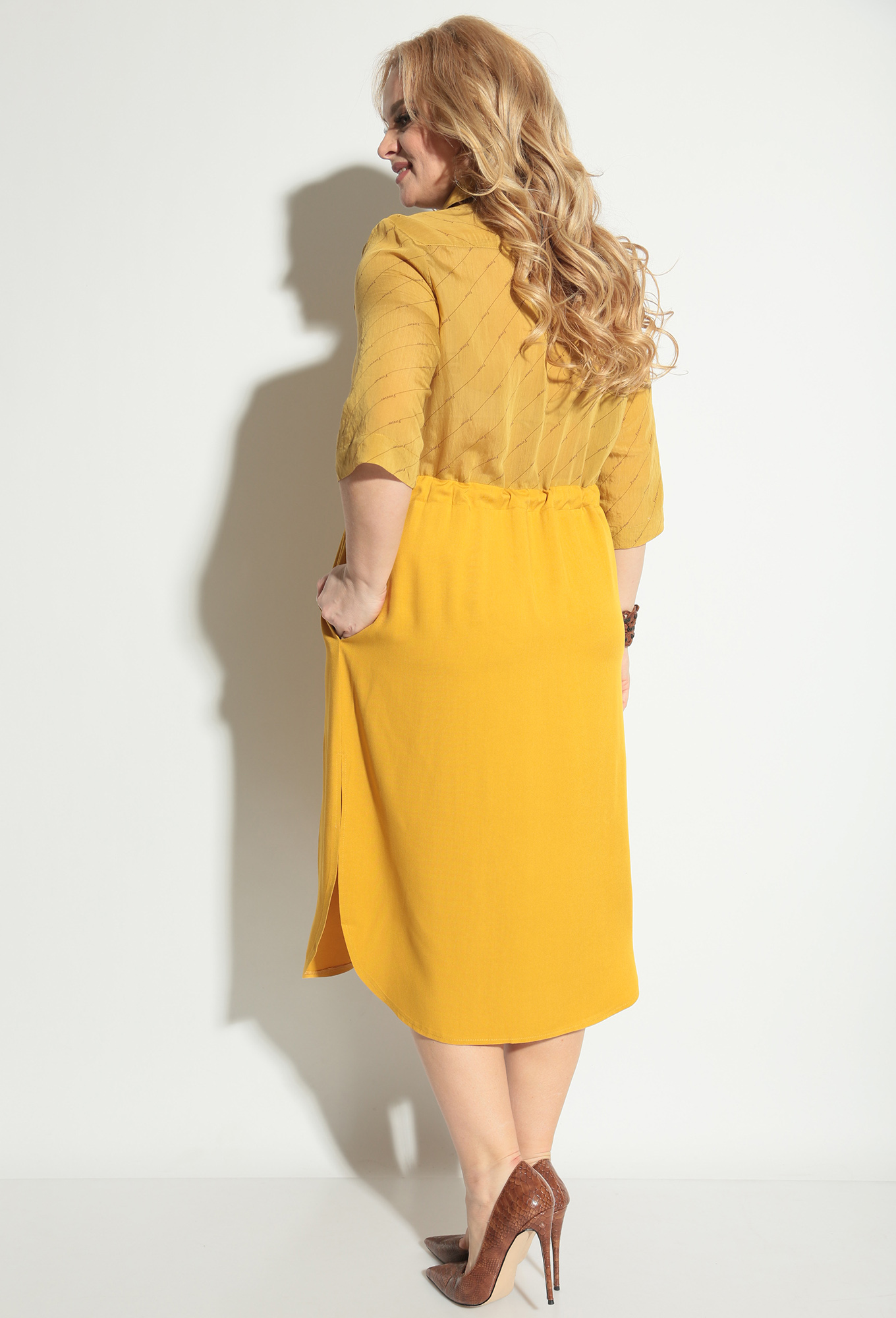 Нарядное и яркое платье рубашечного типа выполнено из вискозы. Натуральные ткани, модный цвет и свободное прилегание сделают его одним из любимых вещей в вашем гардеробе. В юбке скругленный низ переходящему в разрезы, пояс на стяжке которой регулируется плотность прилегания, талия чуть завышена, что визуально удлиняет ноги и прячет возможные нюансы в фигуре. 3/4 рукав с манжетой, которую можно отложить укоротив тем самым длину. На груди клапаны имитирующие карман. Длина по спинке 118 см (±1 см), дина по спинке до пояса-резинки 48 см (±1 см), длина рукава от плечевого шва 46 см. Модель подойдет на рост 170 см.