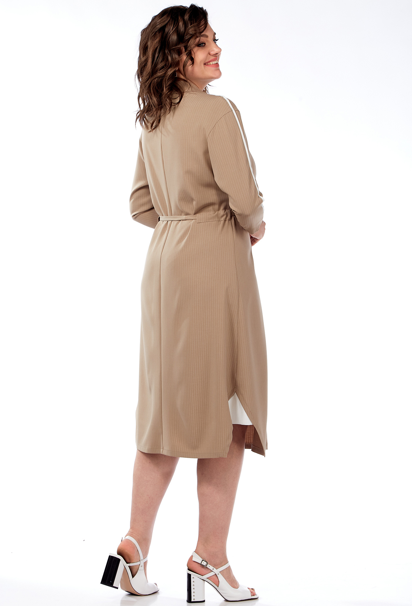 Женское платье-рубашка прекрасно подойдет как для повседневной носки, так и для делового стиля. Платье выполнено из средней плотности плательной ткани в мелкую полоску. По переду рельефы от плечевого шва до низа, спинка с центральным швом. Платье полуприлегающего силуэта, с легким расклешением к низу, за счет рельефов и боковых уголков в разрезах. Платье длинной за колено. Вырез горловины круглый с рубашечным воротником на стойке и центральной застежкой-планкой (на пуговицы). Рукав втачной, двухшовный 3/4. По линии талии настрочная кулиска со съемным поясом из основного материала. Длина изделия по спинке 110 (+/-1)см, длина рукава 61 (+/-1)см. Изделие подойдет на рост 170 см.