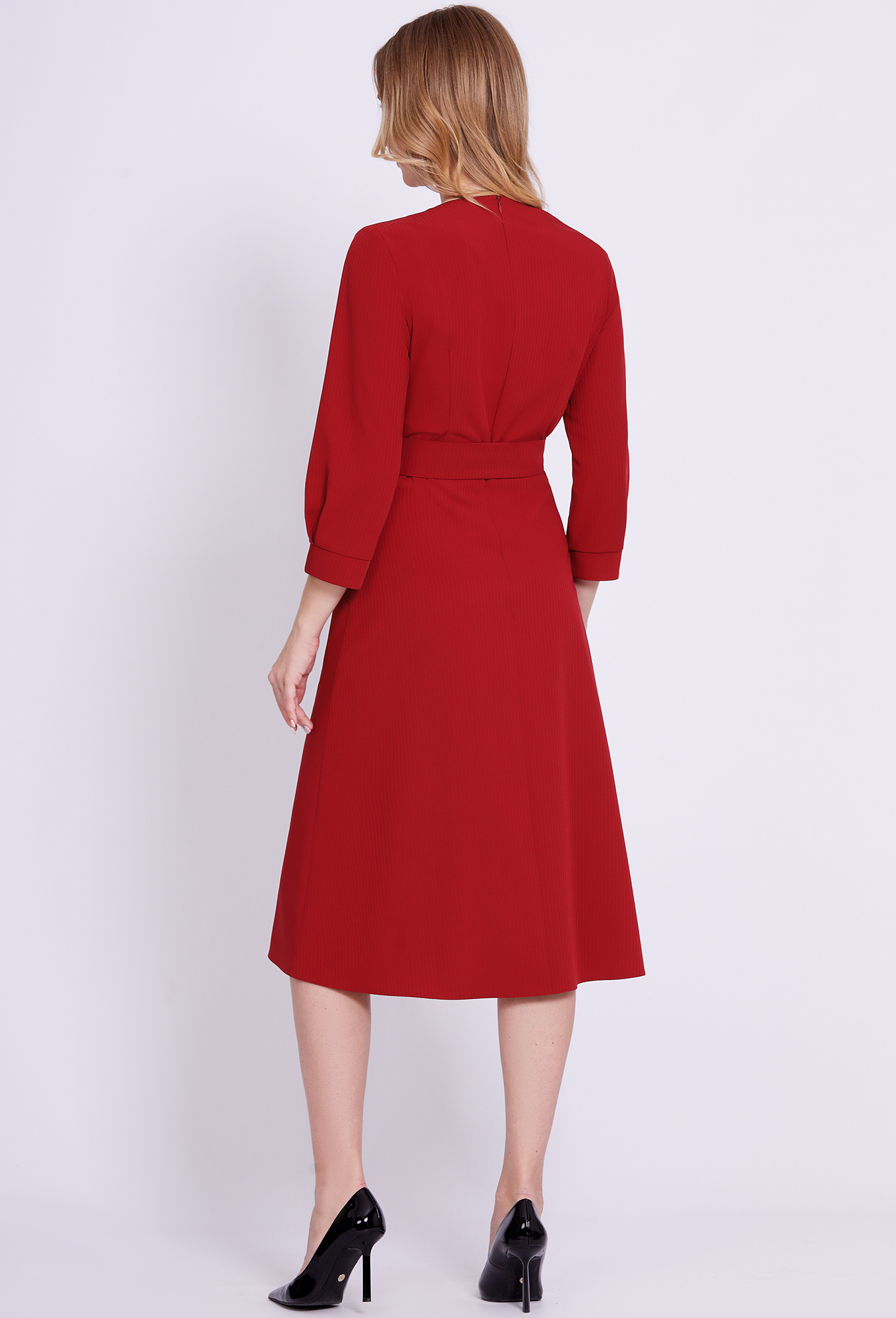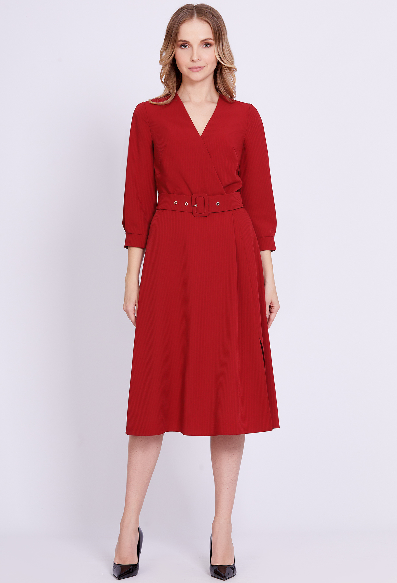Платье-миди интересного кроя полуприлегающего силуэта, отрезное по линии талии и лифом на запах. Перед с V-образным вырезом горловины и косыми нагрудными вытачками в верхней части, вертикальным швом с разрезом и складкой по нижней части. В среднем шве спинки обработана потайная молния. Рукава втачные одношовные со встречными складками по низу и притачными манжетами.