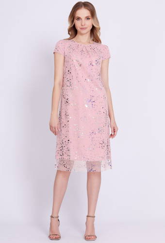 Платье свободного прямого силуэта, длиной макси, выполнено из однотонной ткани и трикотажного полотна “сетка”. В качестве декора использована цепь. Полочка платья с нагрудными вытачками. Горловина круглой формы. В верхней части полочки с правой стороны настрочен карман с цепью. Спинка цельная. Пройма углубленной формы, рукав рубашечного типа, одношовный, по низу с цельнокроеной отложной манжетой. Юбка из сетки со сборкой по верхнему срезу, настрочена на платье. Низ юбки с настрочным воланом из сетки со сборкой.
