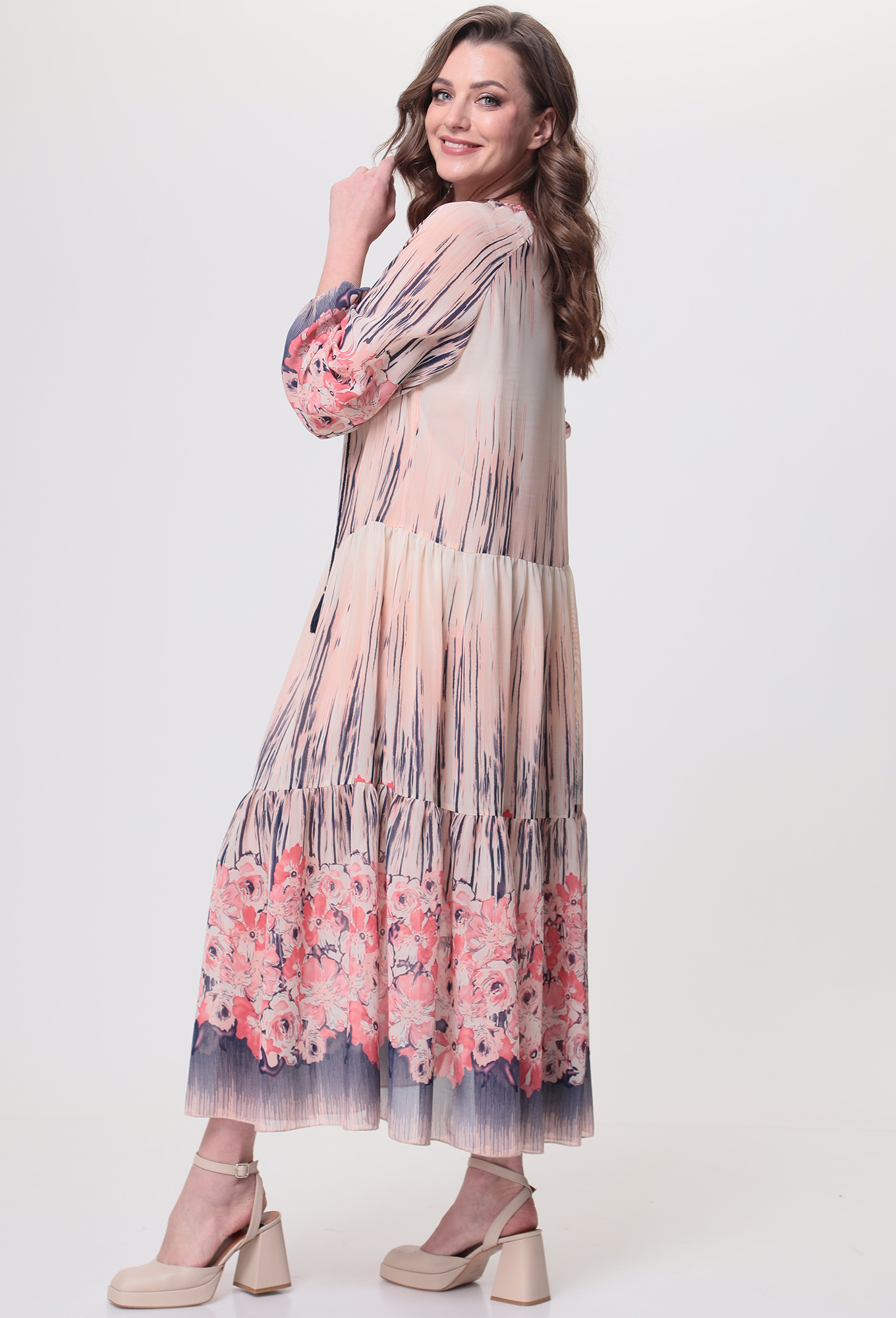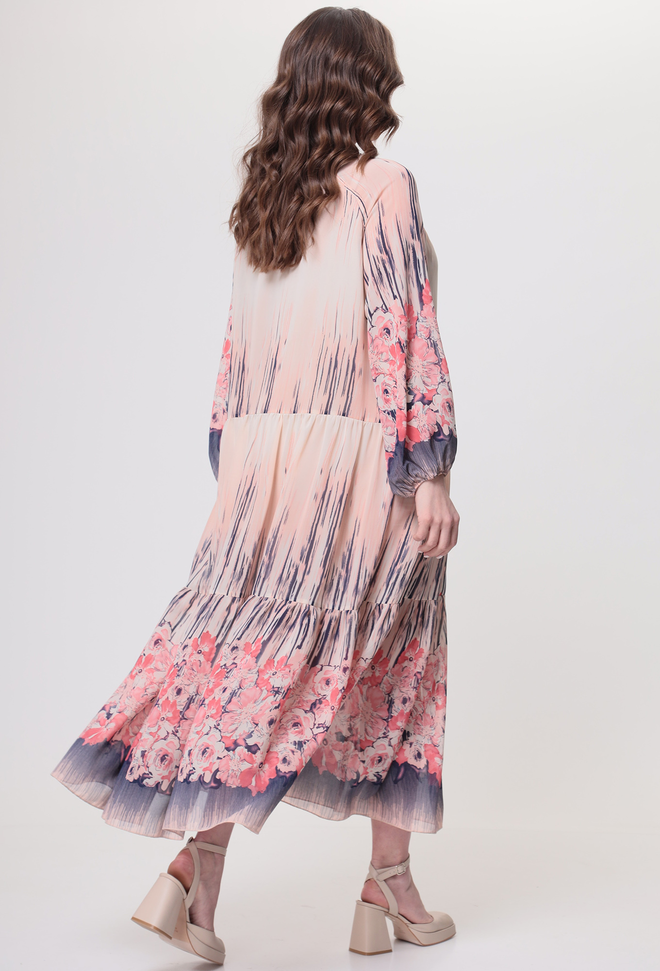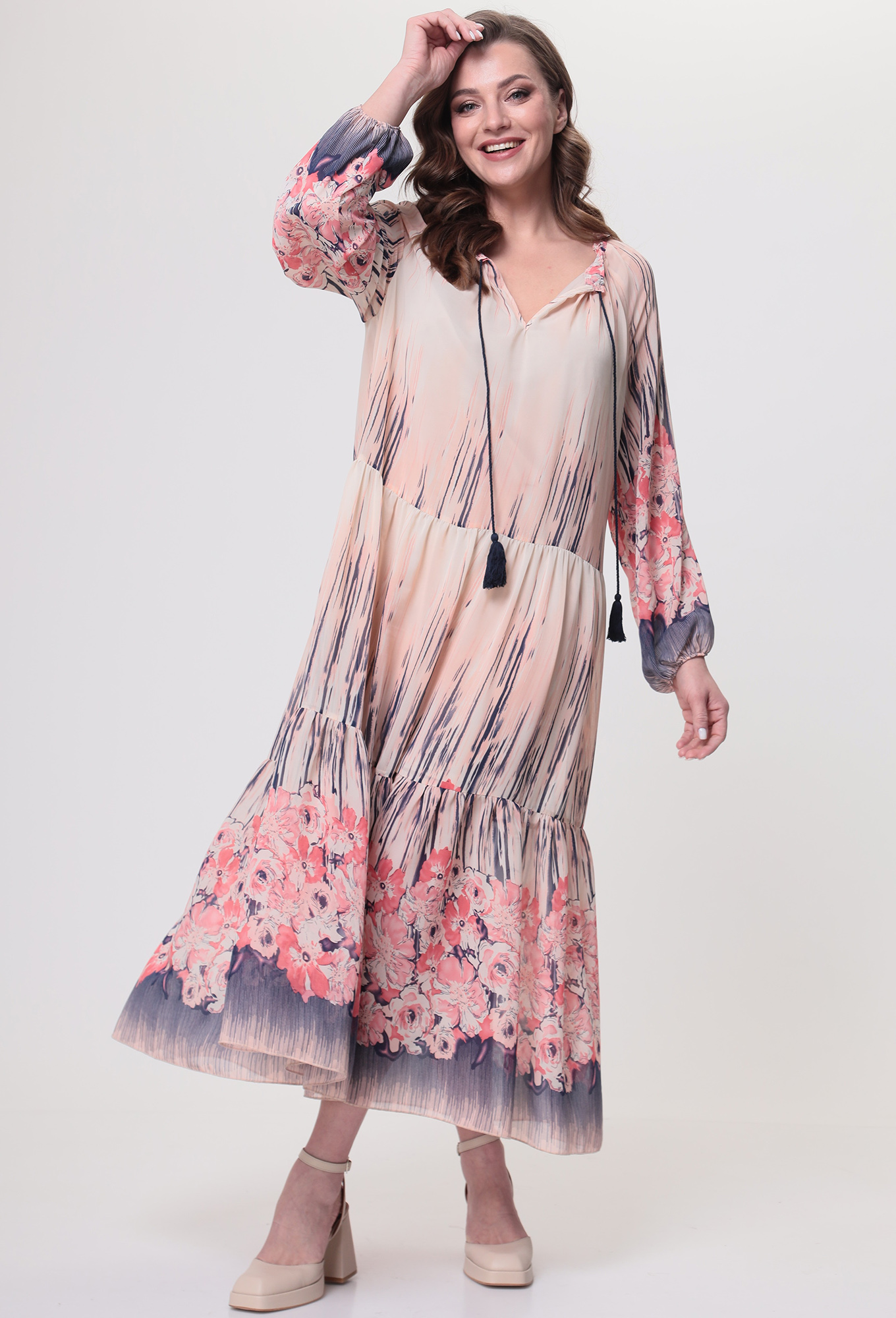 Платье свободного силуэта, выполнено из шифона с набивным рисунком. Платье на подкладке. Верхняя часть полочки цельная, горловина круглой формы, по центру горловины полочки обработан разрез. Верхняя часть спинки цельная. Рукав формы реглан, одношовный, длинный. По низу рукав на резинке. По краю горловины обработана притачная планка с декоративным шнуром. Юбка платья по шву притачивания к верхней части полочки со сборкой и по низу с притачным воланом со сборкой.