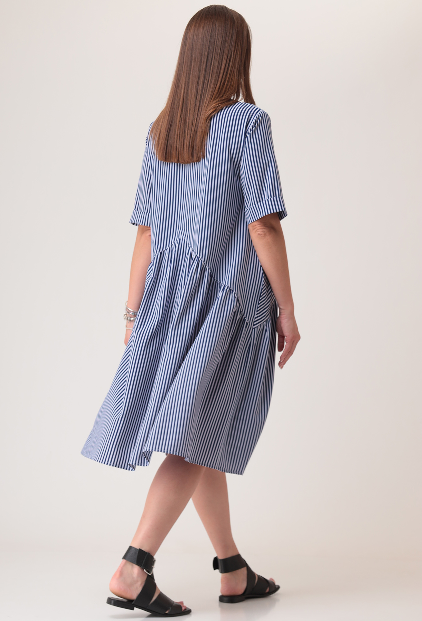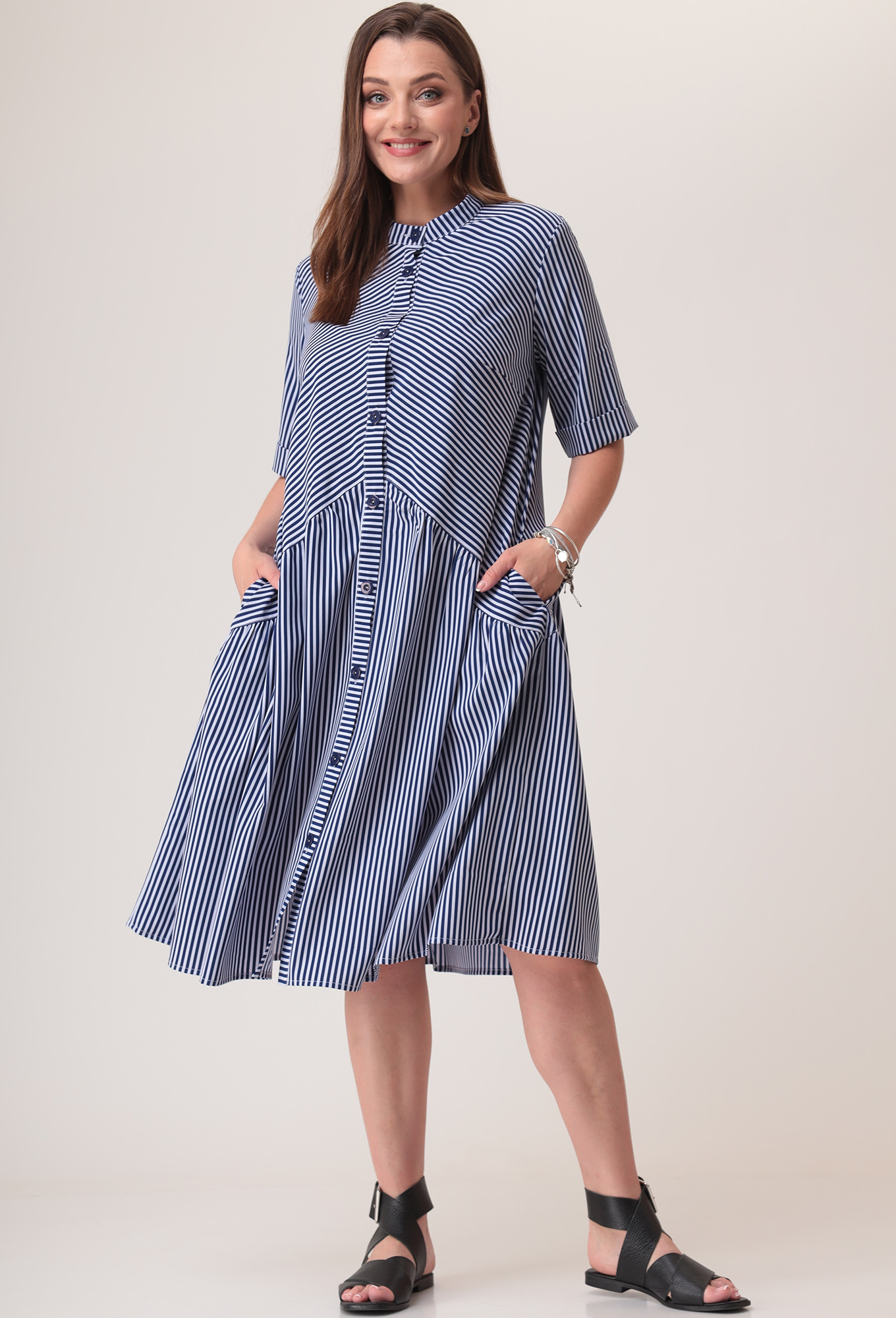 Платье выполнено из ткани в полоску. Платье свободного силуэта, длиной за колено. Полочка платья с центральной застежкой на петли и пуговицы, с нагрудными вытачками и карманами в боковых швах. Горловина круглой формы с воротником стойкой. Спинка цельная. Пройма спущенной формы, рукав рубашечного типа, короткий, одношовный, по низу с цельнокроеной манжетой. Нижняя часть платья со сборкой по шву притачивания к лифу.