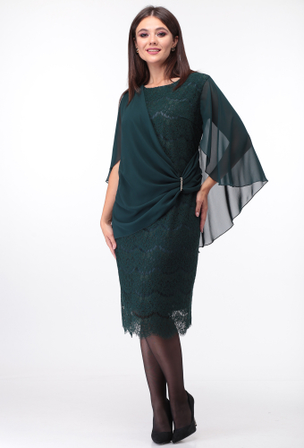 Платье длиной "миди", выполнено из однотонного трикотажного полотна и трикотажного полотна "гипюр". Верхняя часть платья прилегающего силуэта, двухслойная, юбка платья А-силуэта. Полочка платья с вертикальными рельефами, выходящими от пройм. Горловина круглой формы, обработана стояче-отложном воротником с декоративным элементом с левой стороны. Спинка платья с вертикальными рельефами, выходящими от пройм. Рукав одношовный, втачной, длиной 3/4, выполнен из гипюра. Верхняя часть платья по полочке и по спинке с наложением гипюра. Застежка на потайной молнии в левом боковом шве.