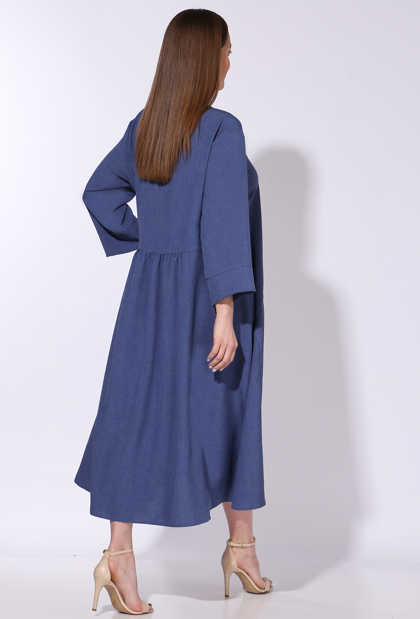 Платье А-образного силуэта, длиной макси. Полочка платья с фигурным подрезом, по нижней части которого выполнена сборка и вертикальные рельефные швы. Горловина круглой формы. Спинка с горизонтальным подрезом, по нижней части которого аналогично полочке, обработана сборка и вертикальные рельефные швы. Пройма углубленной формы, рукав рубашечного типа, одношовный, по низу на притачной, отложной манжете.