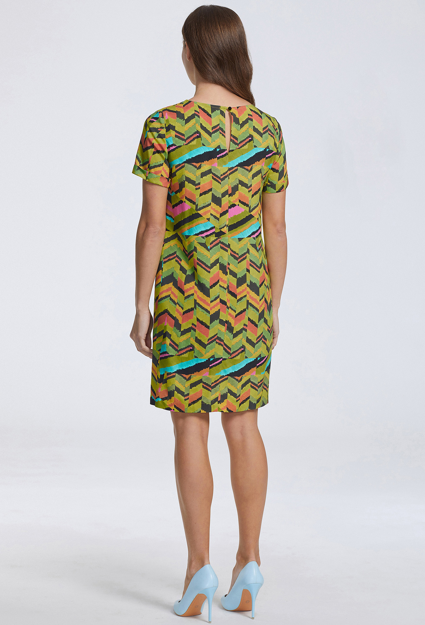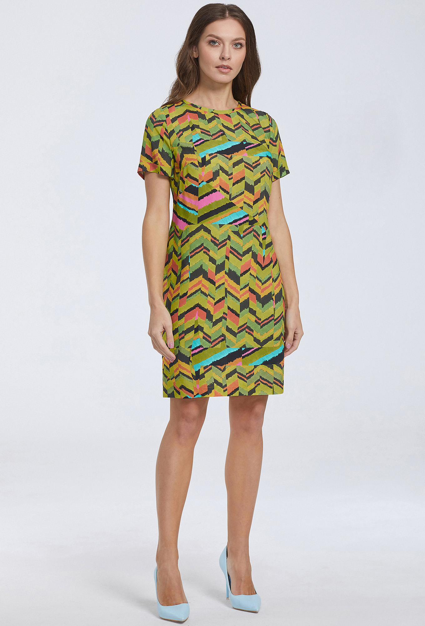 Лаконичность кроя данного платья вполне компенсируется стильным разноцветным принтом. Модель прямого силуэта с округлой формой горловины и короткими втачными рукавами с отложными манжетами, сшили из итальянской легкой, приятной ткани, которая почти не ощущается на теле. Для удобства при носке, в среднем шве спинки предусмотрена застёжка на навесную петлю и пуговицу, а в боковых швах – функциональные карманы.