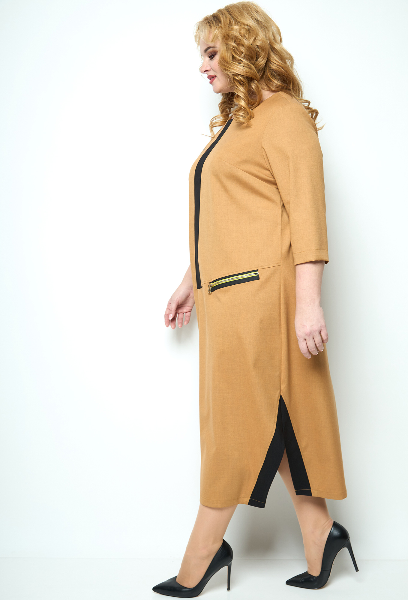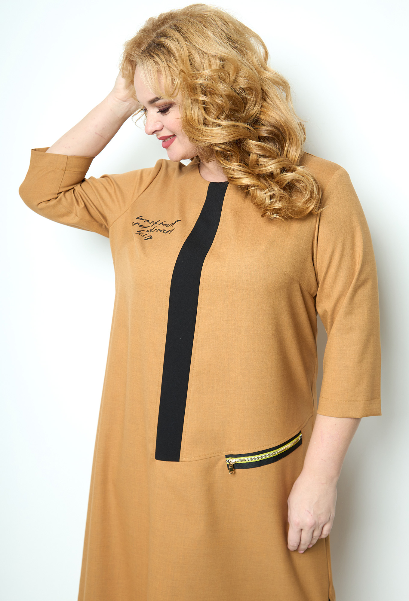 Платье в стиле casual предназначено для повседневной носки, прекрасно сочетается с любой по стилю обувью. Платье свободного кроя, ниже колена, рукав ¾. В качестве декора по переду изделия — вставлена планка из контрастной ткани, также имеется модный принт и имитация кармана, с декоративной молнией. По бокам изделия — разрезы, которые также обработаны контрастной тканью, в цвет декоративной планки. Длина изделия по спинке — 126 см(± 1 см), длина рукава от горловины — 57см(+-1 см). Изделие подойдет на рост 170 см.