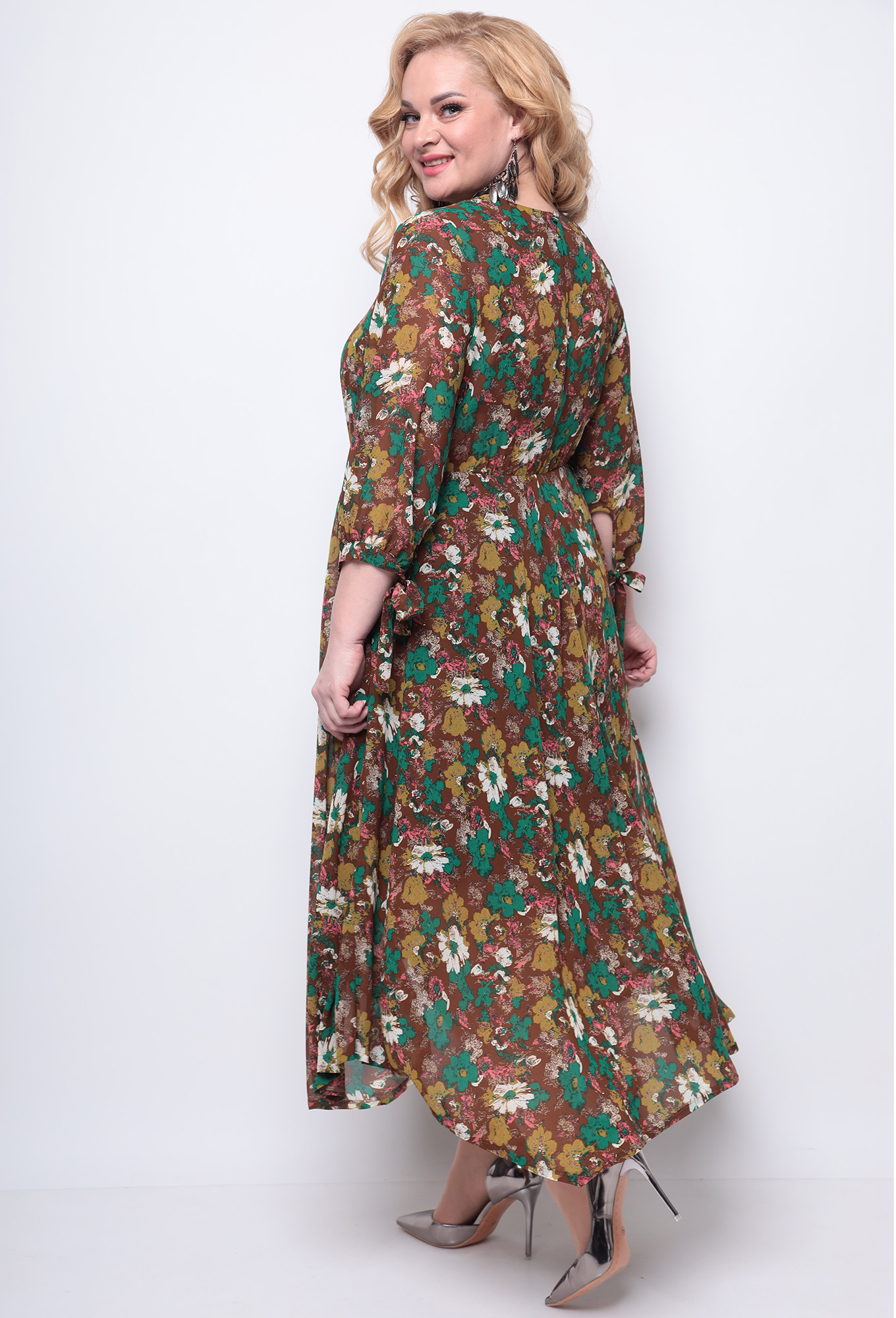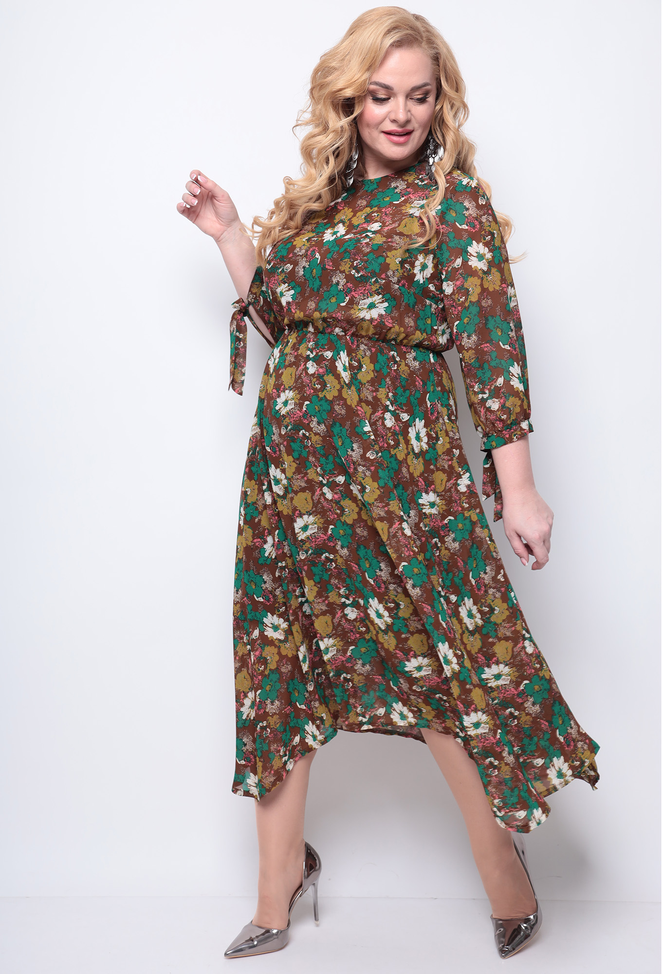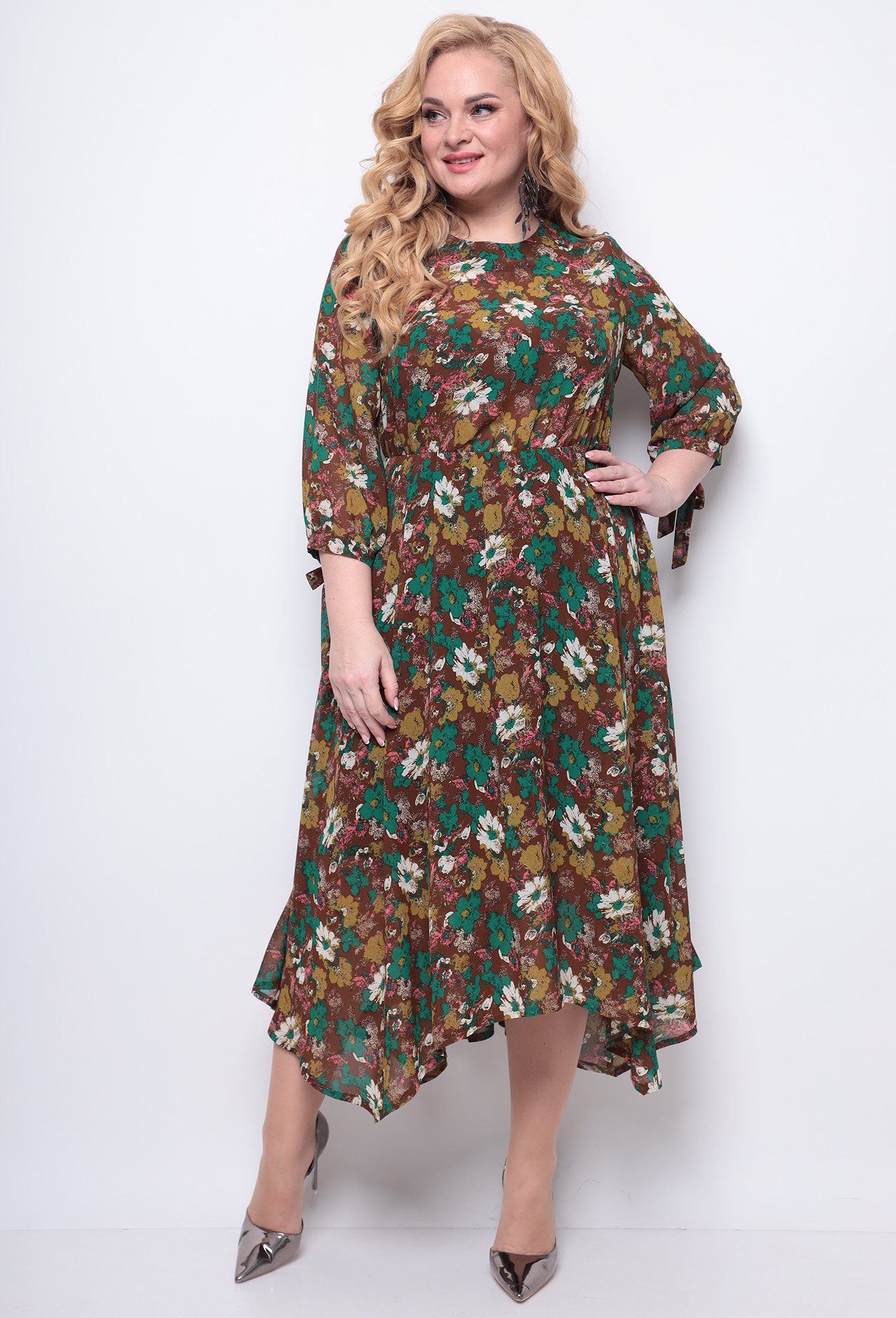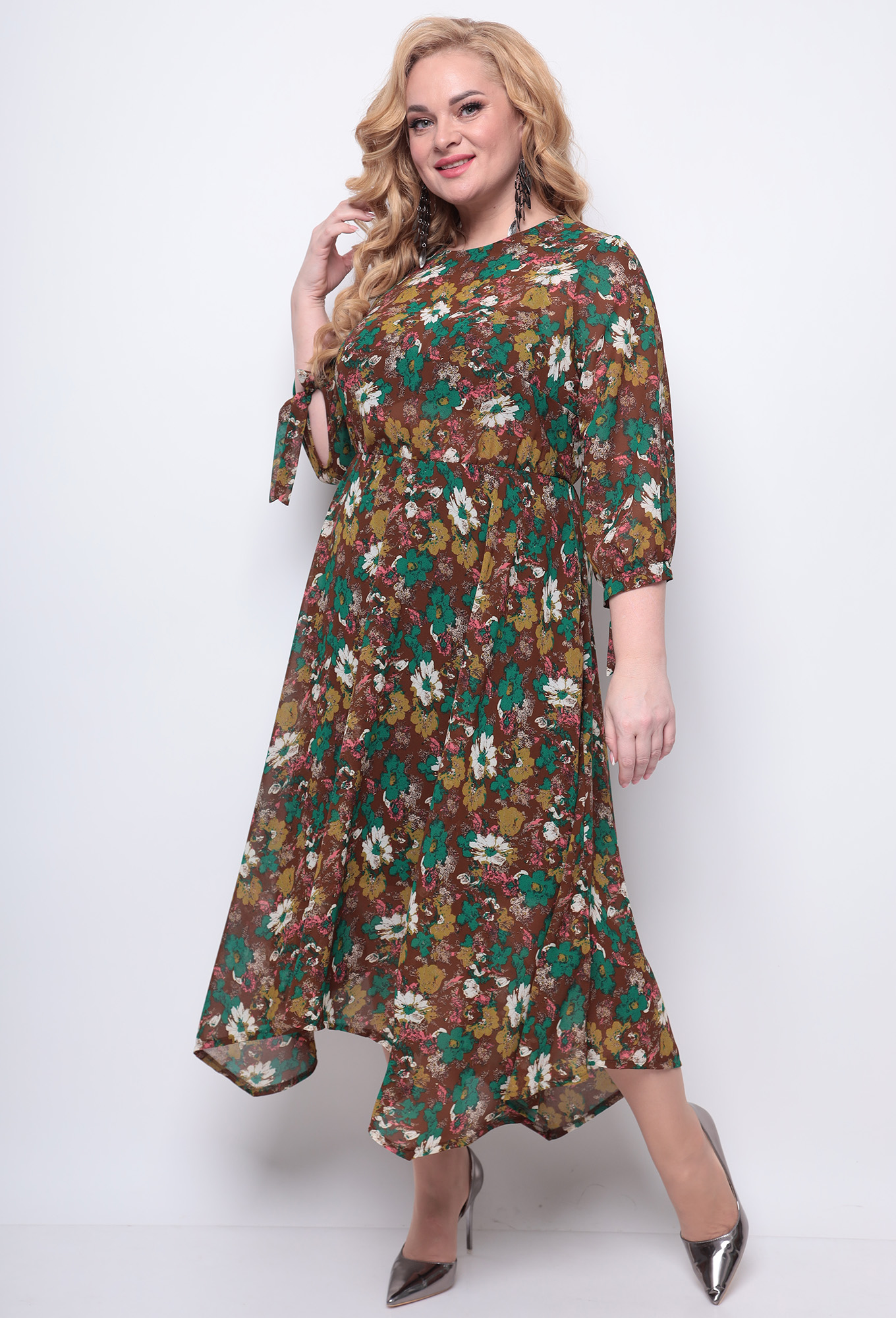 Нарядное платье из тонкого принтованного шифона — тренд настоящего сезона, прекрасно сочетается с любой по стилю обувью и верхней одеждой. Отлично будет смотреться в любом сезоне. Рукав 3/4 чуть расширен к низу, завязывается на тесьму из основной ткани. Верх простого полуприлегающего кроя, с округлой горловиной, сзади застегивающейся на пуговичку. Юбка расклешенная с угловатым низом, что придает изделию дополнительный шарм. По поясу вставлена тонкая резинка. Юбка на трикотажной подкладке. Длина изделия по среднему шву спинки 116 +-1 см., длина рукава от плеча 49 +-1 см. Изделие подходит на рост 170 см.