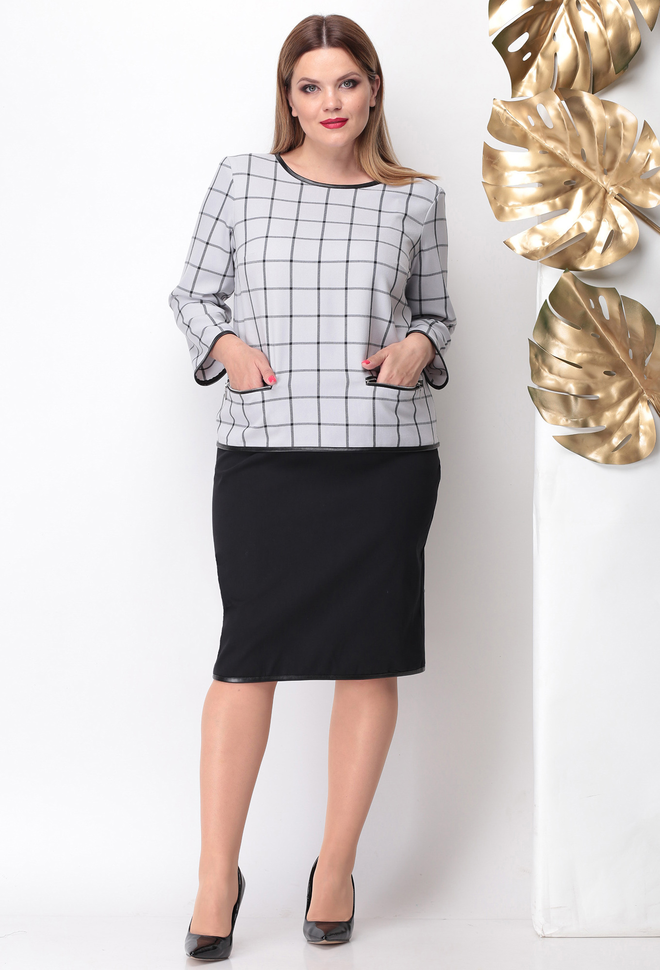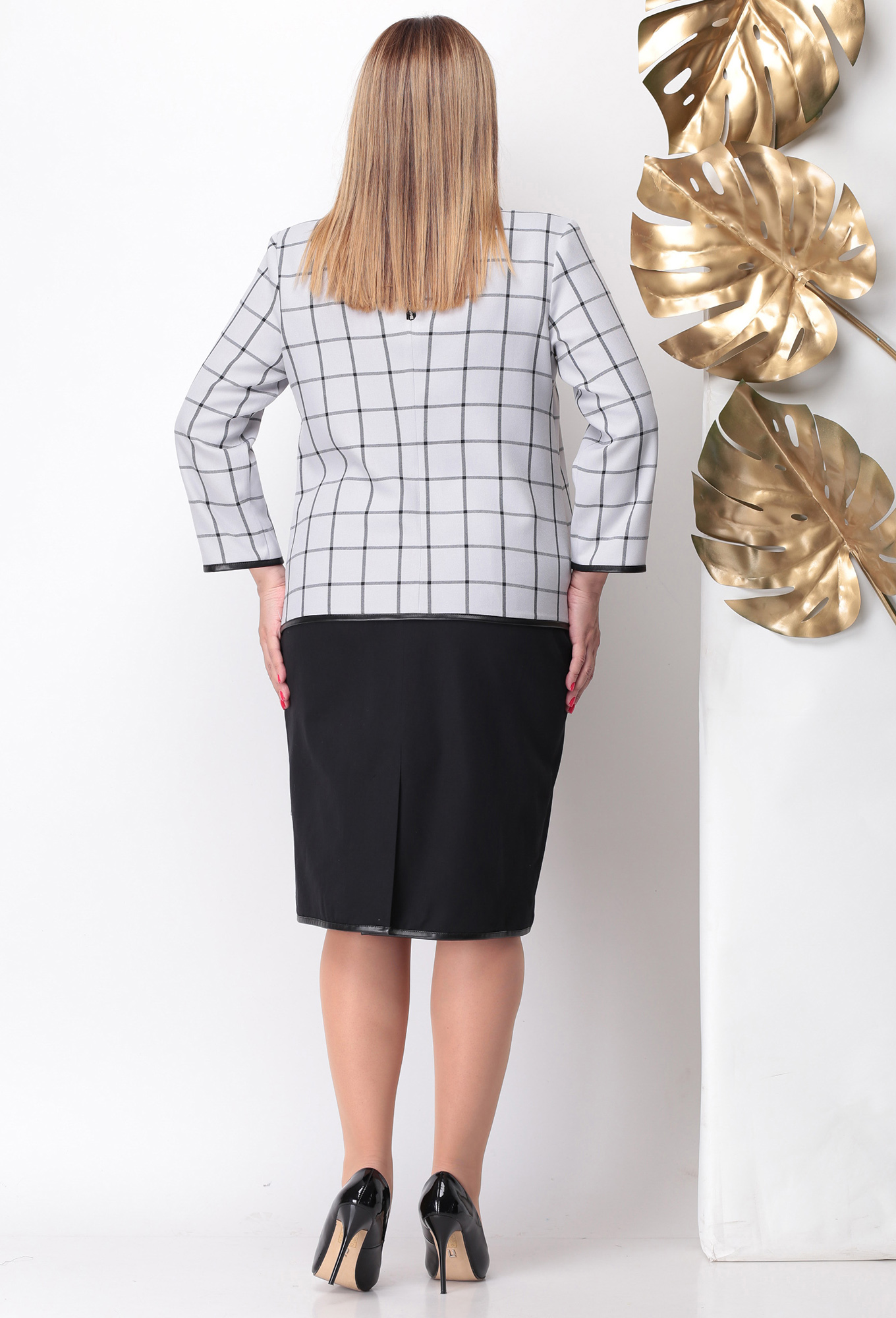 Классический юбочный костюм прекрасно впишется в каждодневный гардероб.Блуза выполнена из приятной на ощупь клетчатой ткани благодаря своему составу практически не мнется и легка в обслуживании. Горловина манжеты и низ изделия, как и подол юбки, обработаны кожаной отделкой. Карманы и застежка на спинке на металлических шлифованных молниях имеющих мягкий ход. В юбке сзади также открытая молния в комплект верхнему изделию. Пояс частично на резинке, украшением служат и косые карманы. длина изделия 64см+-1см. Длина блузы по среднему шву спинки 58см+-1см, длина рукава 52см+-2см