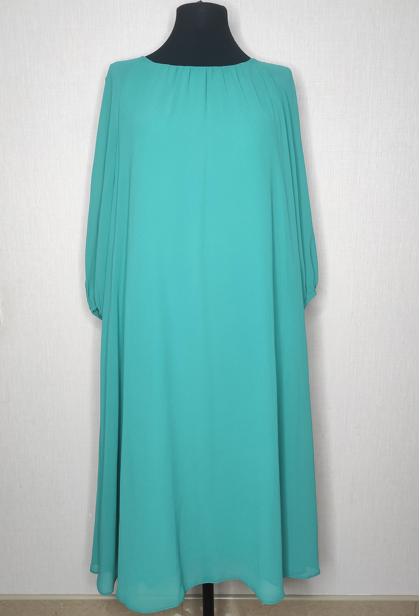 Яркий оттенок задаёт настроение платью, а интересный крой, скульптурные драпировки и летящий в движении свободный силуэт непременно помогут попасть в центр внимания. Изделие со сборкой по горловине переда и укороченными прозрачными рукавами покроя реглан со сборкой по низу, собранной на узкую эластичную тесьму, сшито из лёгкого  шифона. Для удобства в носке, по спинке платья обработана щелевидная застёжка на петлю и пуговицу.