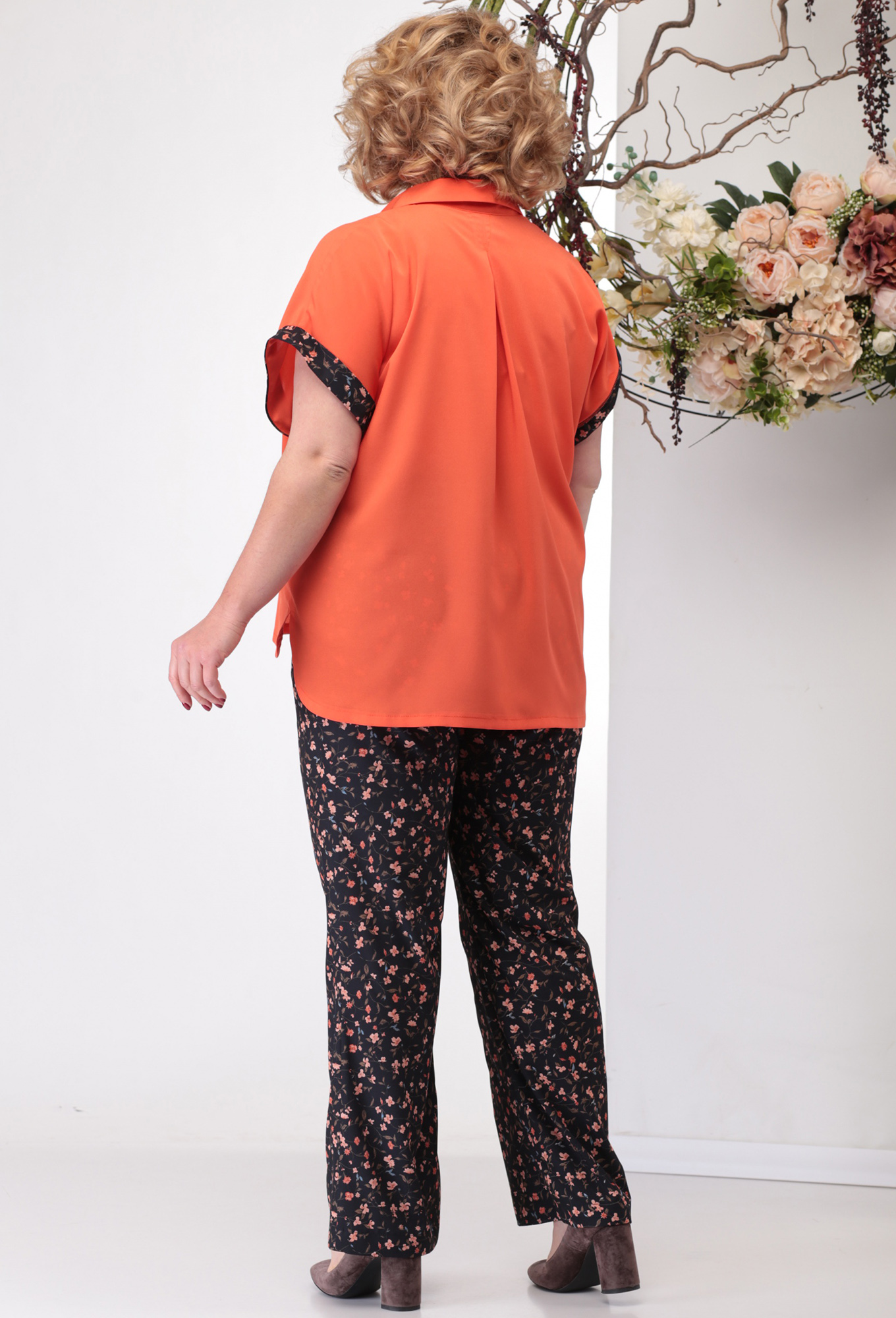 Костюм-двойка выполнен из 100-процентной вискозы без стрейча в мелкий геометрический рисунок. Брюки прямые, полусвободного облегания с высокой посадкой, спереди на молнии с гульфиком, на поясе по спинке вставлена резинка, а также имеет декоративный пояс. Блузка свободного облегания, спинка чуть удлинена по отношению к переду, рукав спущенный на манжете. На спинке от воротника встречная складка. Длина брюк по боковому шву 105+-1см., по внутреннему шву 76+-1см.; длина блузки по спинке 72+-1см.