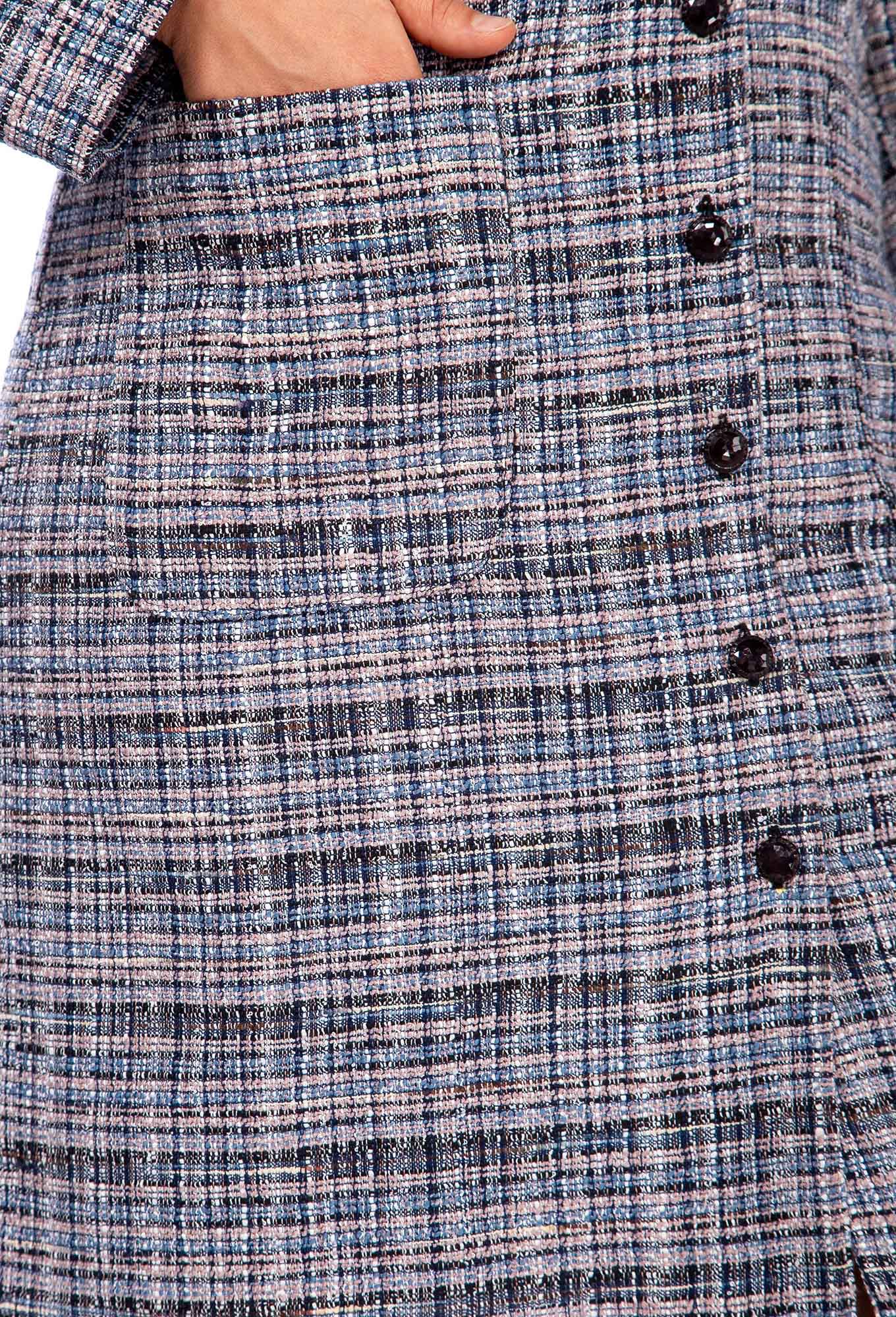 Платье женское выполнено из ткани шанель , полуприлегающего силуэта, застегивается на декоративные петли –пуговицы. Платье с плечевыми накладками, есть действующие карманы. Цвет платья синий.