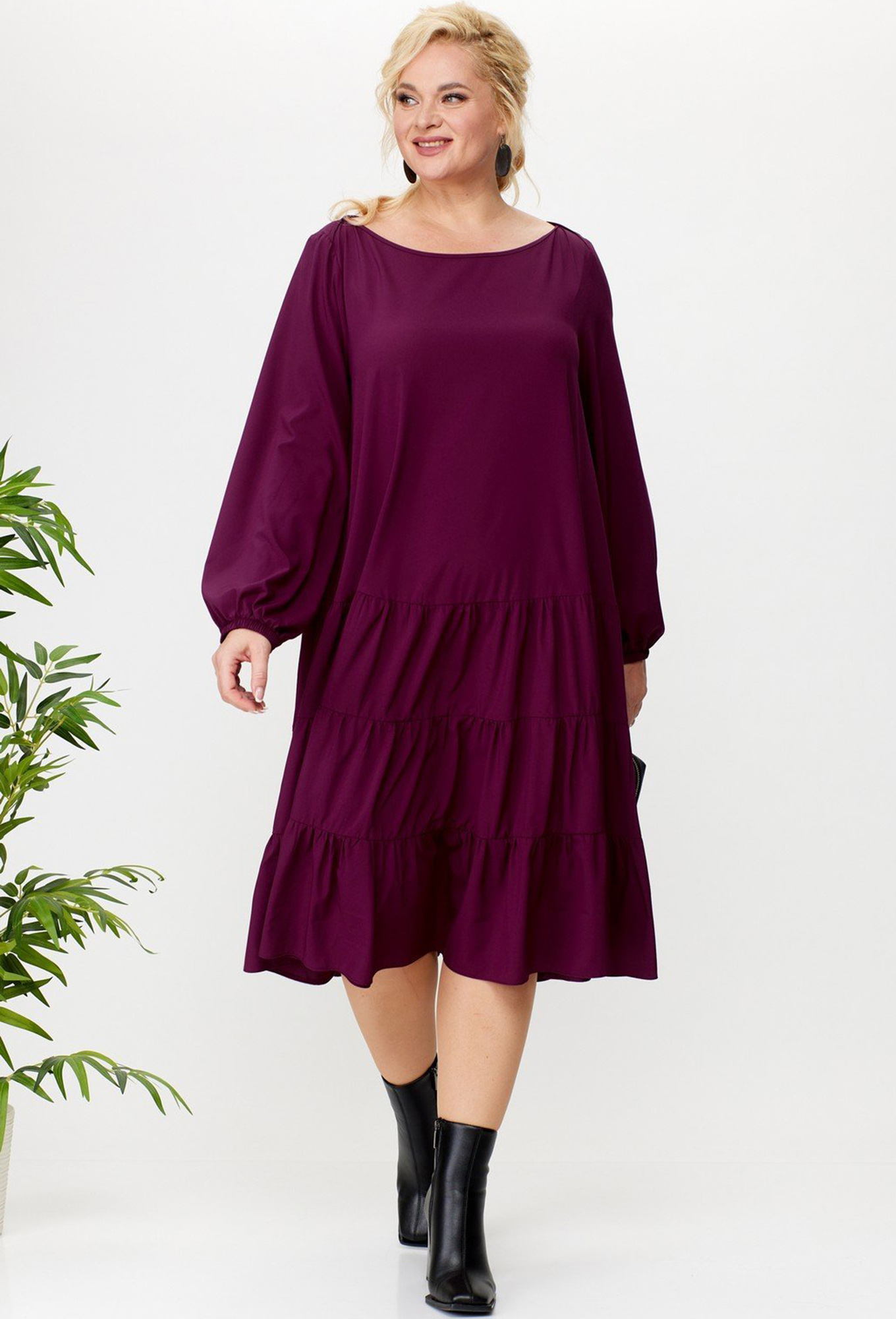 Платье женское из текстильной ткани. Модель трапециевидной формы с 3-мя воланами, рукав длинный на резинке, вырез в форме лодочки, окантован.