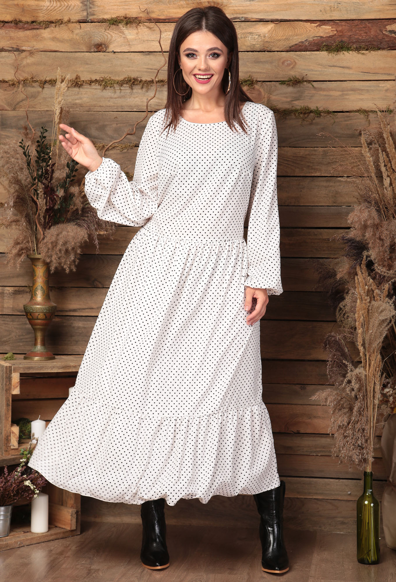 Платье женское из текстильной ткани в горошек. Платье отрезное по линии талии, юбка присобрана, на подкладке. По полочке идут выточки. Горловина овальной формы, окантована. Рукав втачной,одношовный длинный. По низу рукава резинка.По низу платья широкий присобранный волан.