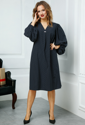 Платье женское, полуприлегающего силуэта. По полочке идет нагрудная выточка из бокового шва. Вырез V-образной формы с планками и складкой по центру. По спинке средний шов, рукав объемный, по окату сборка. Низ рукава фигурный, на резинке.