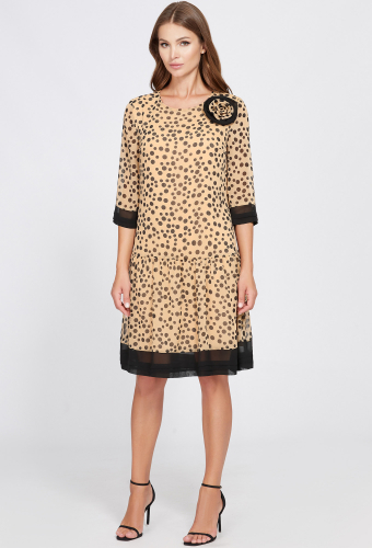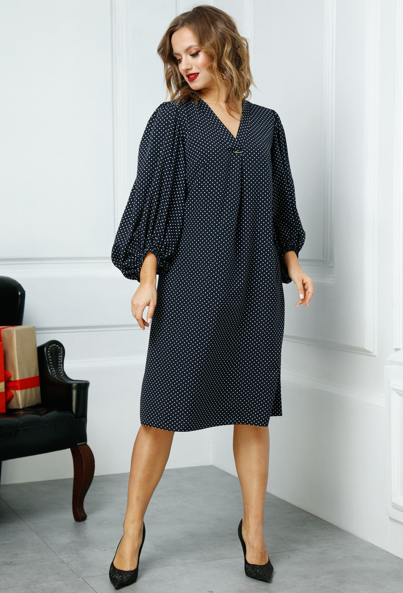 Платье женское, полуприлегающего силуэта. По полочке идет нагрудная выточка из бокового шва. Вырез V-образной формы с планками и складкой по центру. По спинке средний шов, рукав обьемный, по окату сборка. Низ рукава фигурный, на резинке.