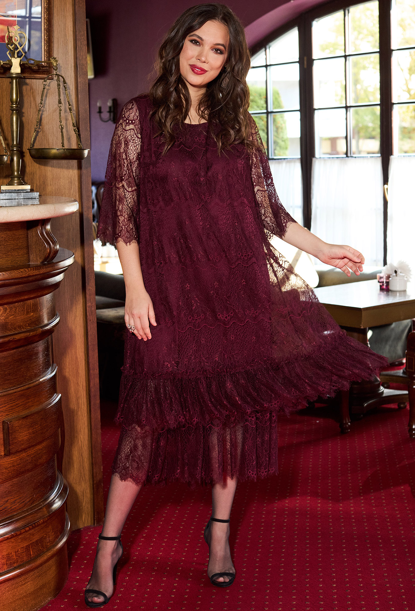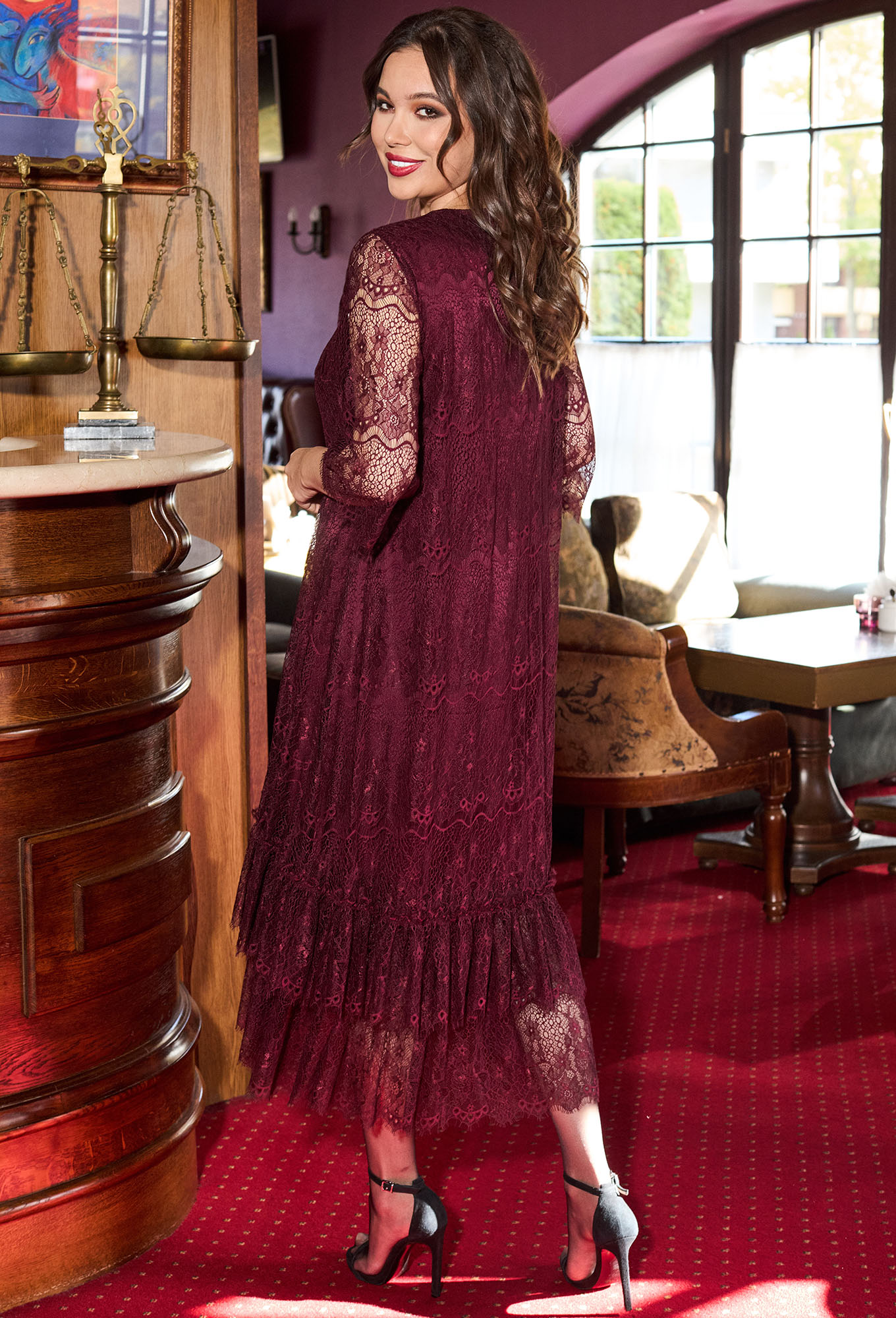 Платье А-силуэта, длиной за колено, двухслойное, выполнено из кружева и однотонной ткани. Полочка платья с нагрудными вытачками, горловина круглой формы, спинка цельная. Рукав втачной, одношовный, длиной 3\4. Низ платья ассиметричный, обработан двойным слоем притачных воланов.
