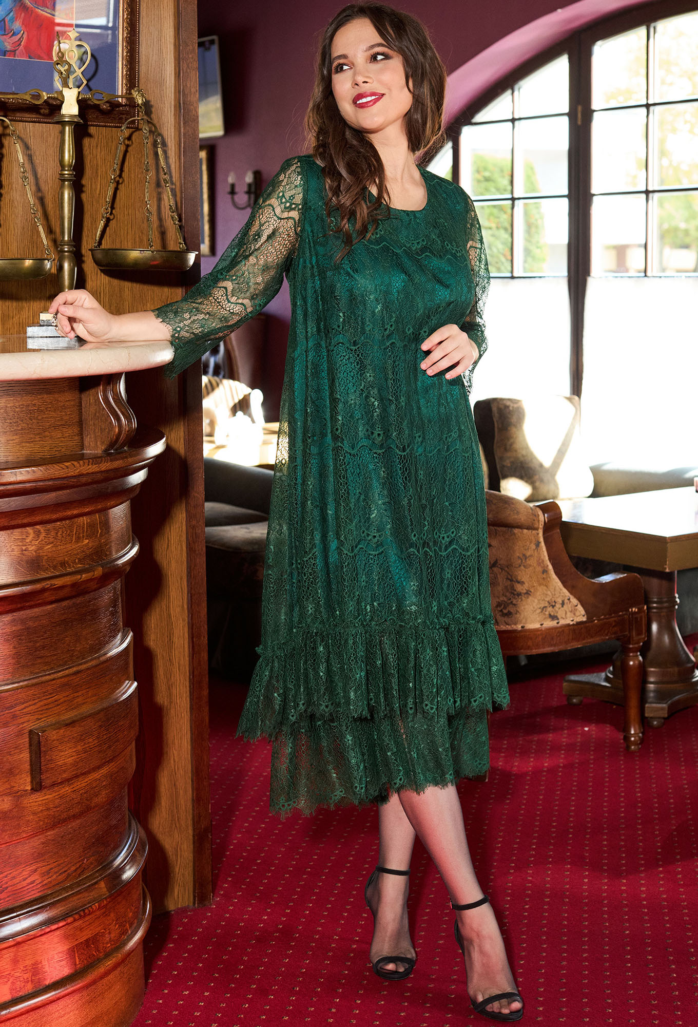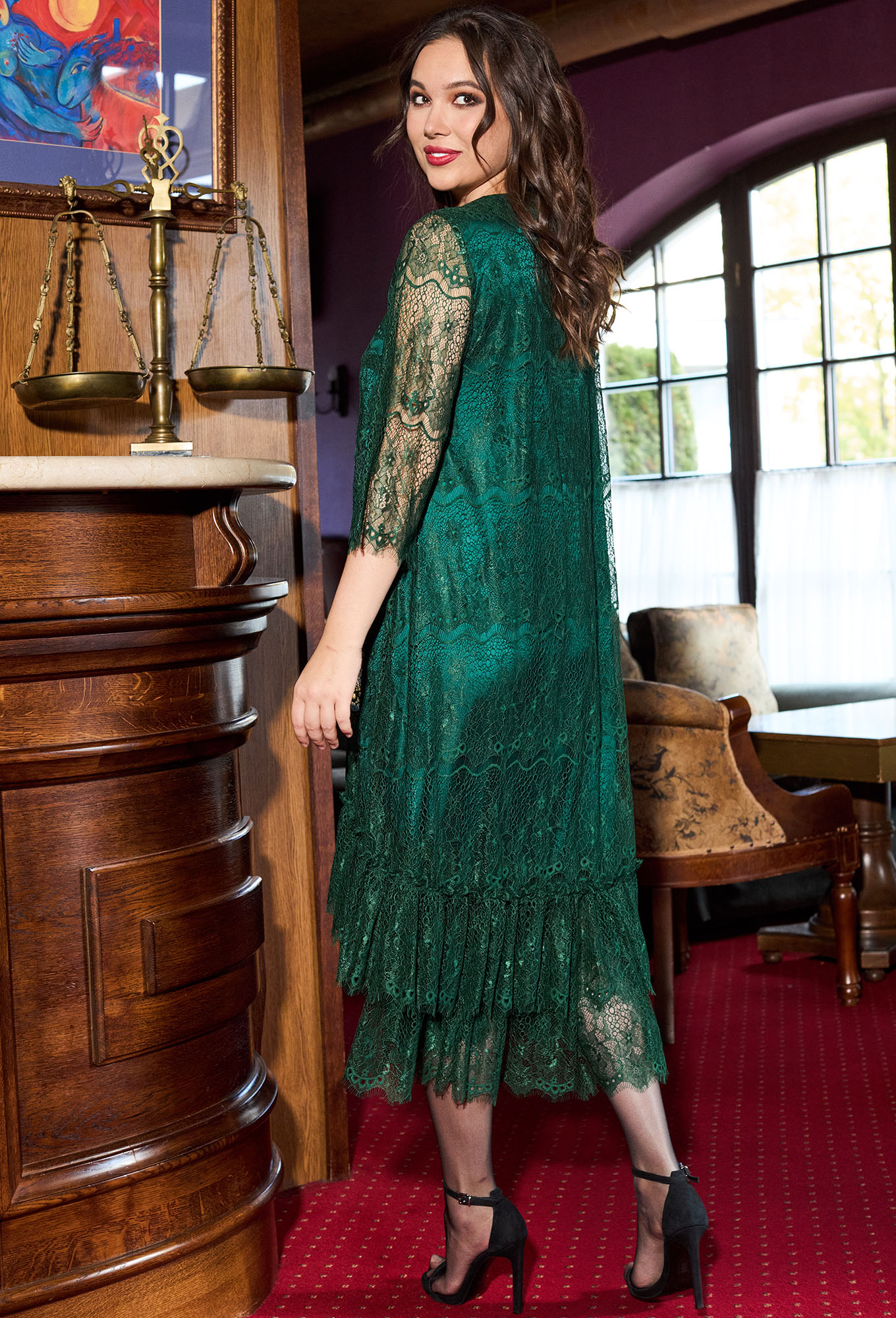 Платье А-силуэта, длиной за колено, двухслойное, выполнено из кружева и однотонной ткани. Полочка платья с нагрудными вытачками, горловина круглой формы, спинка цельная. Рукав втачной, одношовный, длиной 3\4. Низ платья ассиметричный, обработан двойным слоем притачных воланов.
