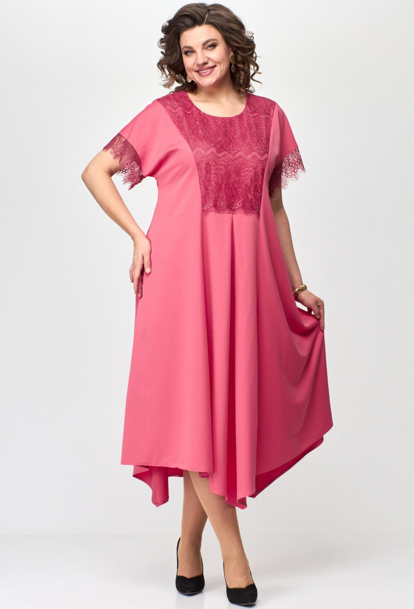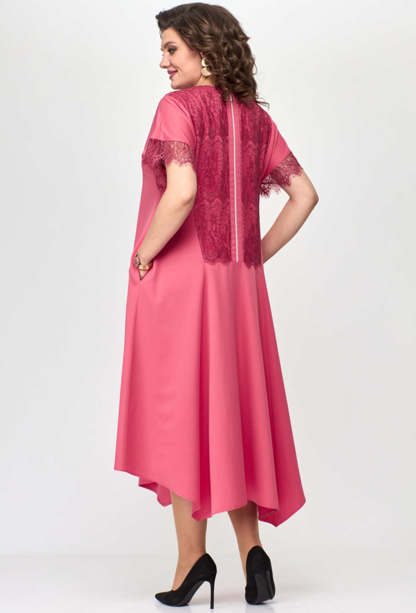 Полочка платья с отрезной кокеткой по центральной, верхней части полочки. Кокетка выполнена с наложением кружевного полотна. Нижняя центральная часть полочки со складкой по центру. Горловина круглой формы. Спинка платья аналогично полочке, с отрезной кокеткой с наложением кружевного полотна и застежкой на молнию по центру. Рукав платья цельнокроеный, длиной до локтя, по низу рукав обработан притачной манжетой из кружевного полотна. В боковых швах выполнены карманы. Низ платья ассиметричный.