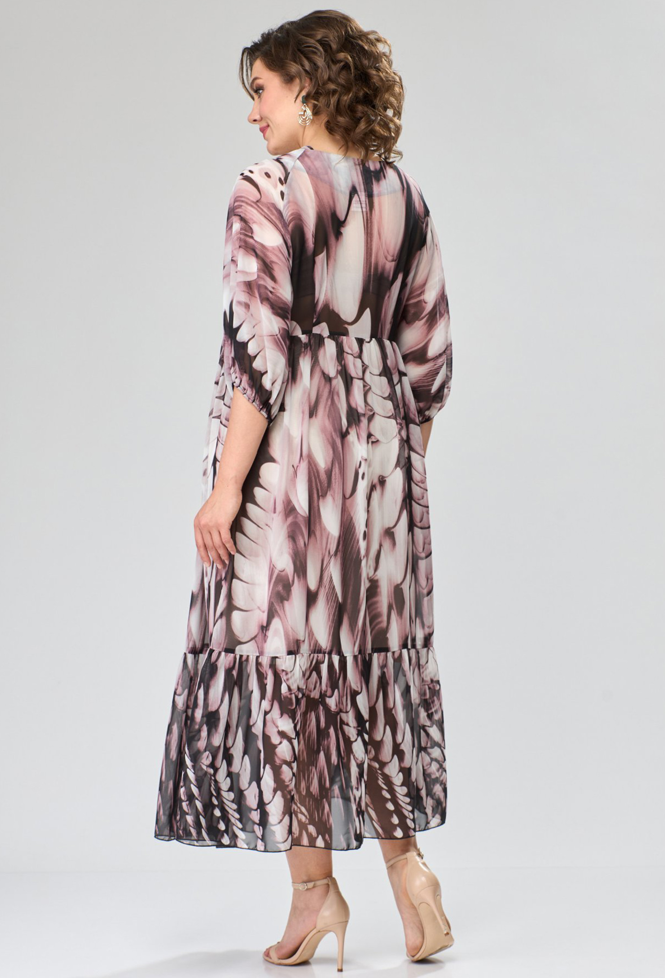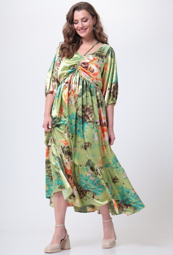Платье свободного силуэта, длиной макси, выполнено из ткани из шифона с набивным рисунком. Платье с отрезным лифом. Полочка лифа двухслойная, нижняя часть с нагрудными вытачками и фигурным подрезом. Верхняя часть с кулисой по центру, через которую продеты шнуры. Спинка лифа с талиевыми вытачками. Рукав формы реглан, одношовный, длиной за локоть. По низу рукав на резинке. Юбка платья со сборкой по шву притачивания к лифу и притачным воланом со сборкой по низу юбки.