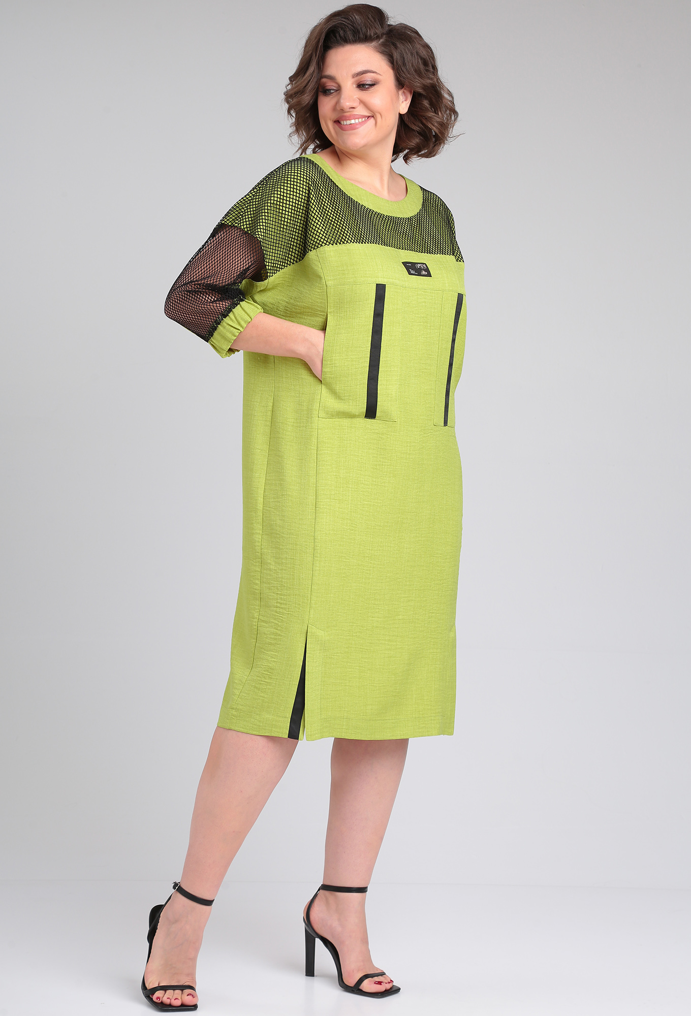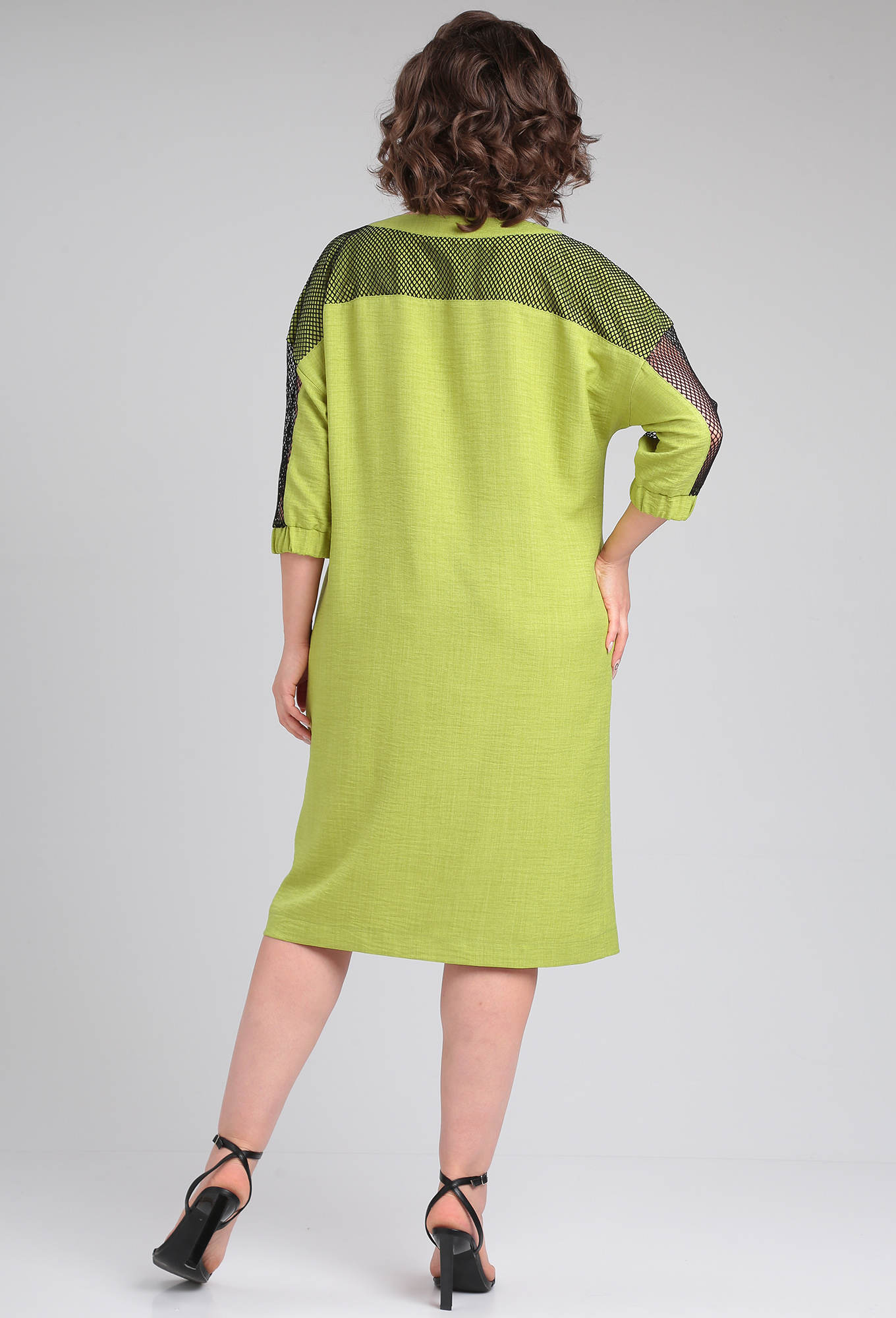 Платье прямого силуэта, длиной за колено выполнено из однотонной ткани, в качестве отделки использована контрастная по цвету однотонная сетка.